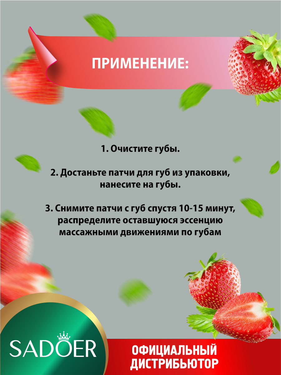 | Состав | Увлажняющие патчи для губ Sadoer с экстрактом клубники 8 гр. х 5 шт. |