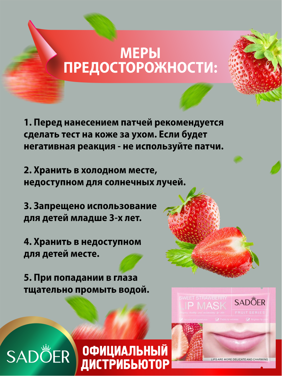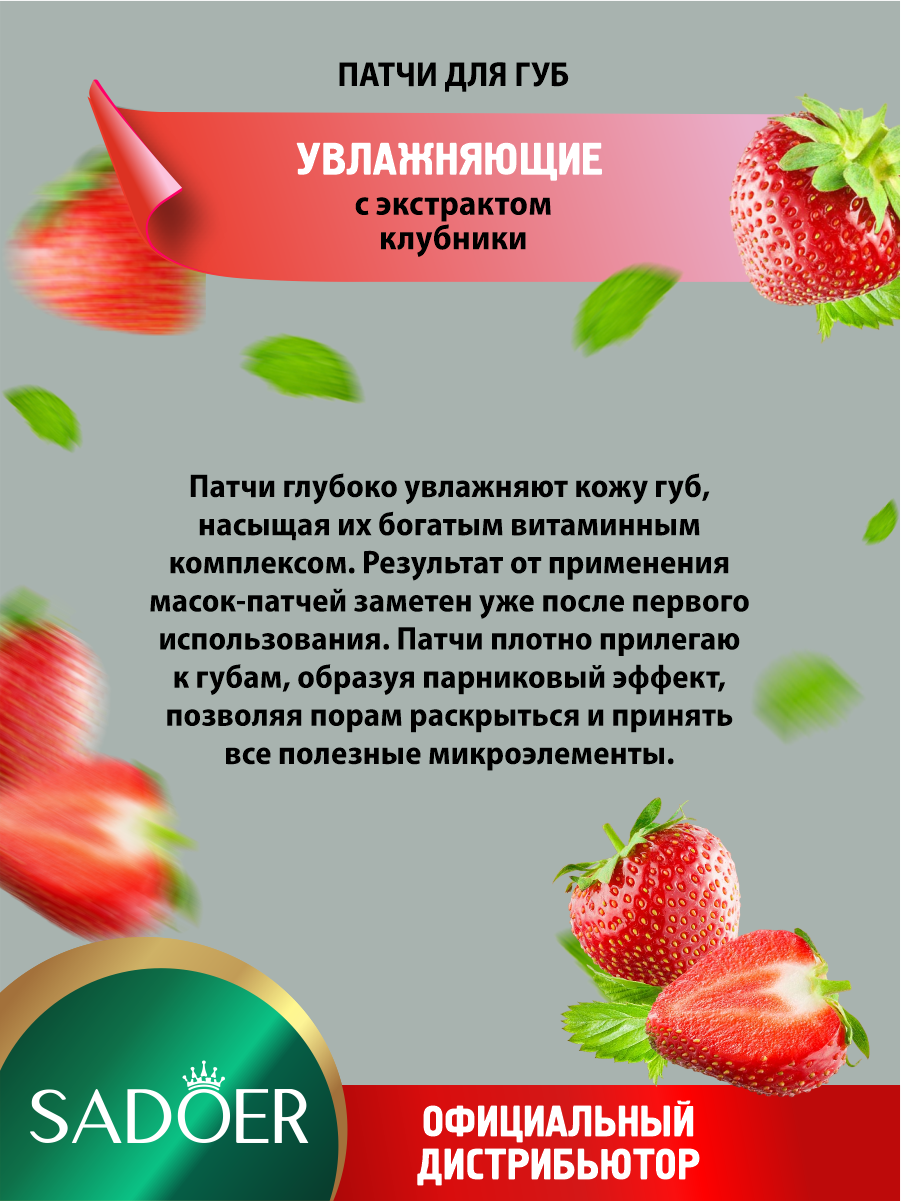 | Состав | Увлажняющие патчи для губ Sadoer с экстрактом клубники 8 гр. х 5 шт. |