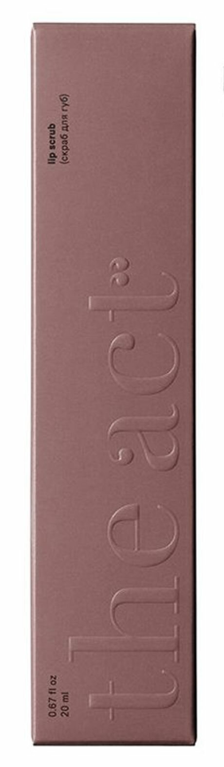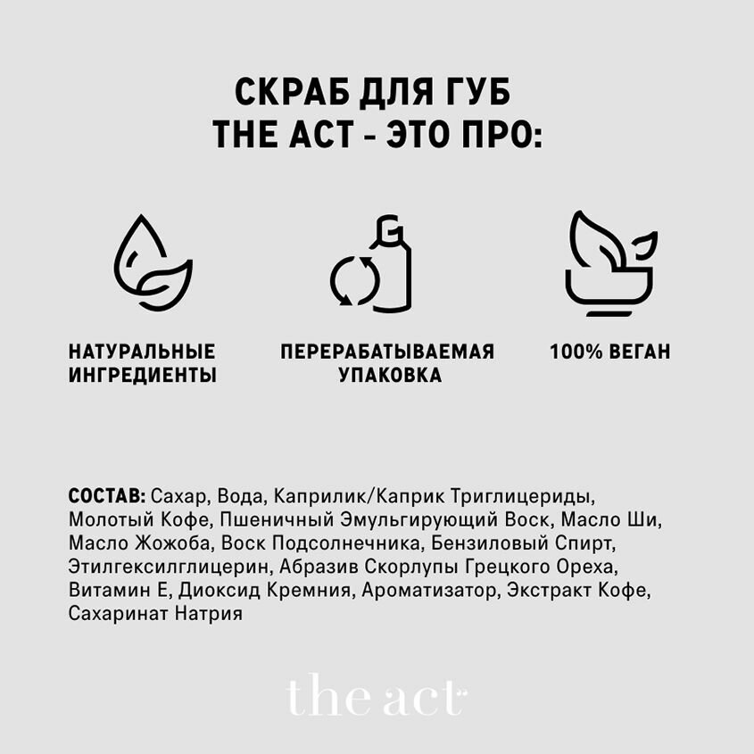 | Способ применения | Нанесите на кожу губ небольшое количество скраба легкими движениями, помассируйте, смойте скраб теплой водой. Используйте 1-2 раза в неделю или при необходимости дополнительного разглаживания кожи перед макияжем. Для наилучшего результата в качестве завершающего этапа ухода воспользуйтесь бальзамом для губ The Act с высоким содержанием пантенола, пептидом и комплексом натуральных масел. |