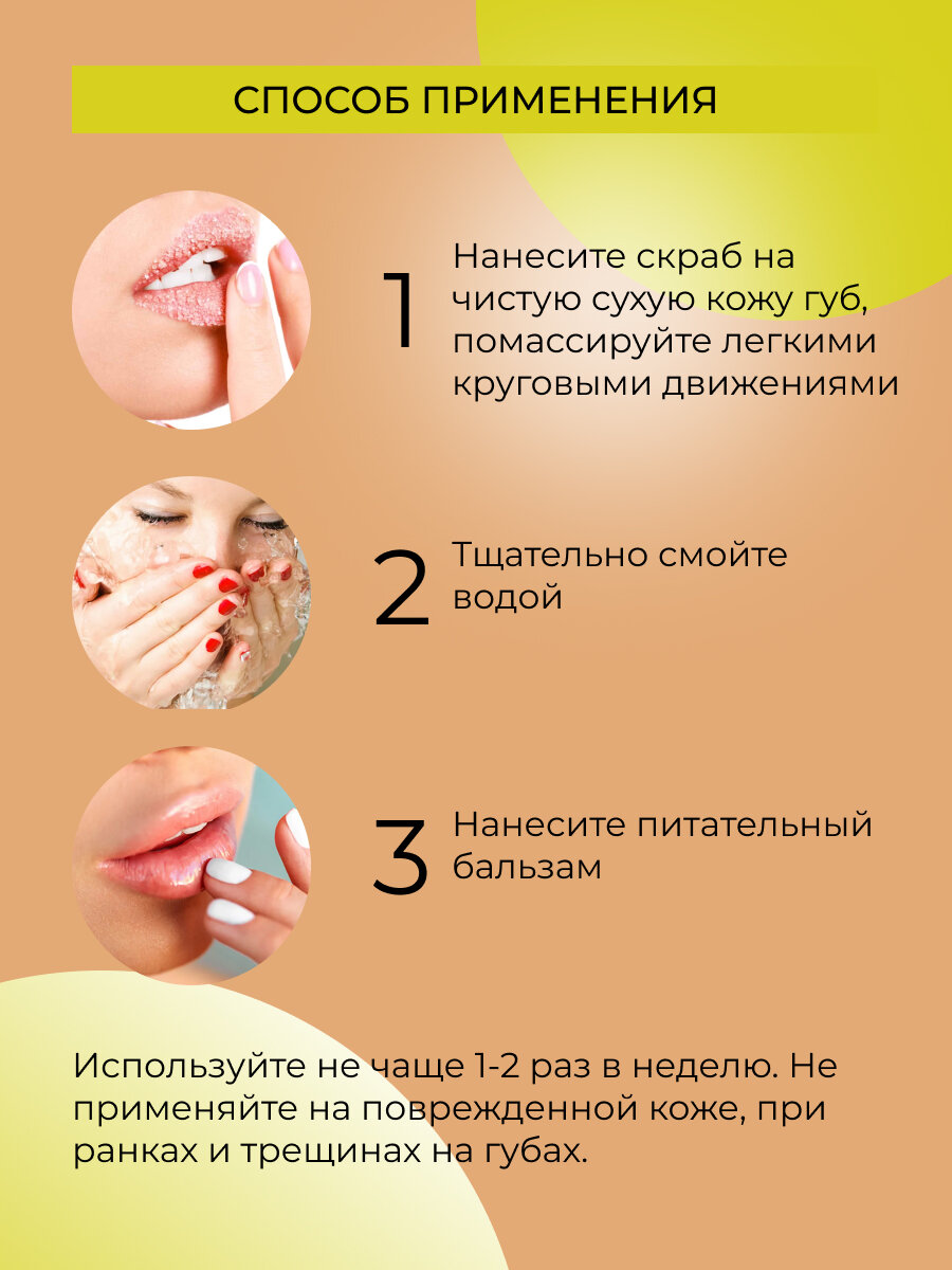 | Способ применения | Нанесите скраб на чистую сухую кожу губ, помассируйте легкими круговыми движениями, тщательно смойте водой и нанесите питательный бальзам. Используйте не чаще 1-2 раз в неделю. Не применяйте на поврежденной коже, при ранках и трещинах на губах. |