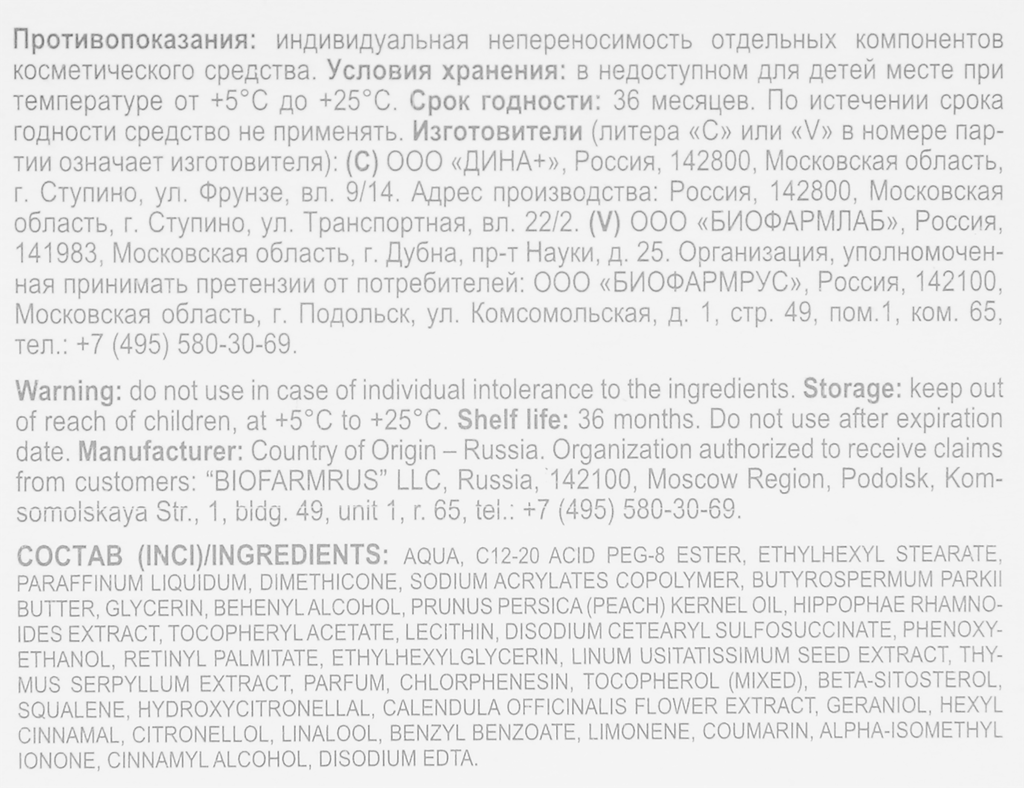 | Состав | Aqua, c12-20 acid peg-8 ester, ethylhexyl stearate, paraffinum liquidum, dimethicone, sodium acrylates copolymer, butyrospermum parkii butter, glycerin, behenyl alcohol, prunus persica (peach) kernel oil, hippophae rhamnoides fruit extract, tocopheryl acetate, lecithin, disodium cetearyl sulfosuccinate, phenoxyethanol, retinyl palmitate, ethylhexylglycerin, linum usitatissimum seed extract, vitis vinifera seed extract, satureja hortensis extract, parfum, chlorphenesin, tocopherol (mixed), beta-sitosterol, squalene, hydroxycitronellal, calendula officinalis flower extract, geraniol, hexyl cinnamal, citronellol, linalool, benzyl benzoate, limonene, coumarin, alpha-isomethyl ionone, cinnamyl alcohol, disodium edta |