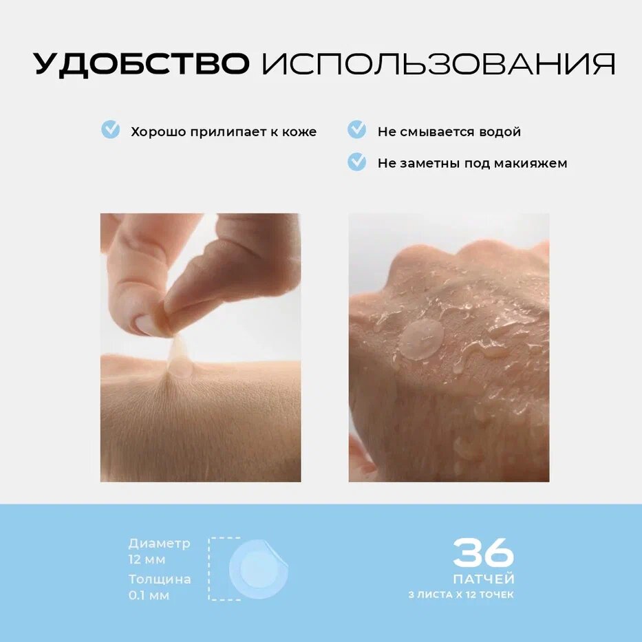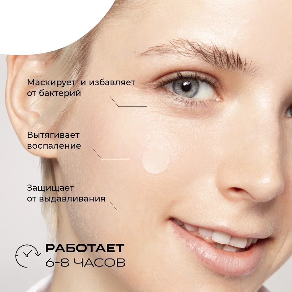 | Способ применения | 1. Перед нанесением патча тщательно очистите пораженный участок и прилегающую кожу от макияжа и загрязнений средством, не содержащим масла в составе. Просушите кожу от влаги. 2. Наклейте патч липкой стороной вниз на пораженный участок. 3. Оставьте патч на 6-8 часов. 4. Отклейте патч, как только тот побелеет или по прошествии времени. 5. Только для наружного применения. 6. Избегать попадания в глаза и в руки детям. 7. Не использовать повторно. 8. Хранить в прохладном и сухом месте. |