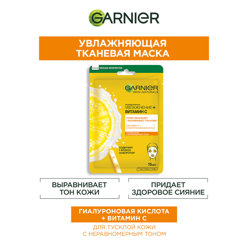 Купить Garnier Тканевая маска для лица "Увлажнение+Витамин С" увлажняет и выравнивает тон кожи, 23 г