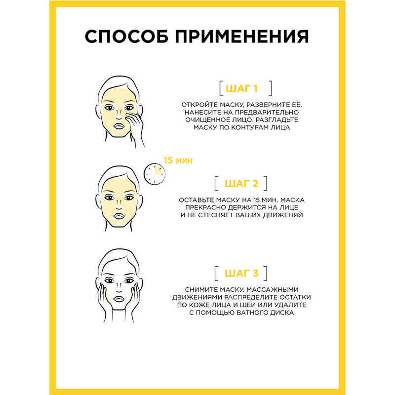 | Способ применения | откройте маску, разверните ее. Нанесите на предварительно очищенное лицо. Разгладьте маску по контурам лица. Оставьте маску на 15 минут. Маска прекрасно держится на лице и не стесняет ваших движений. Снимите маску. Массажными движениями распределите остатки по коже или удалите с помощью ватного диска |