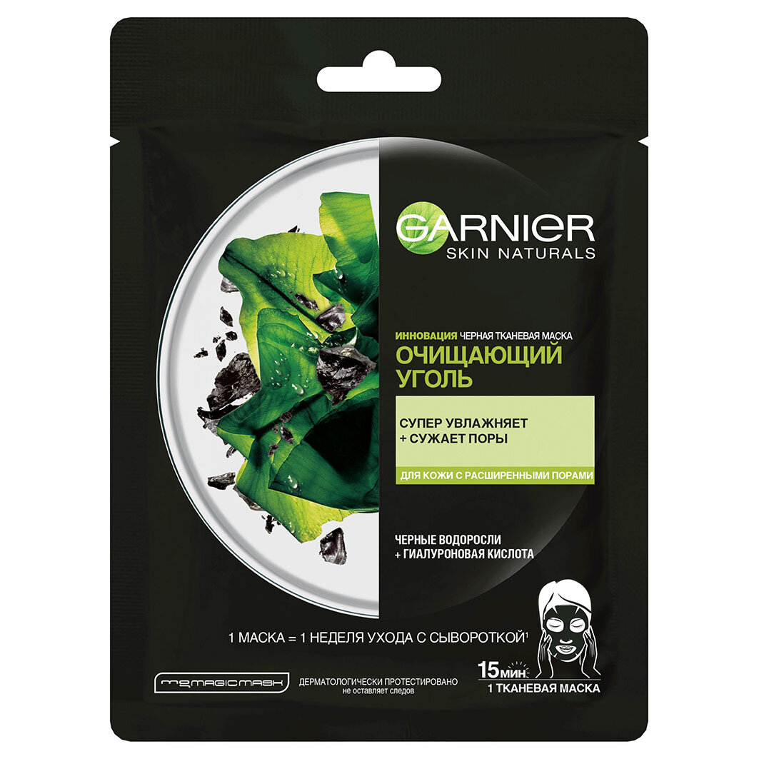 Garnier Черная Тканевая маска "Очищающий Уголь + Черные водоросли", увлажняющая, сужающая поры, для кожи с расширенными порами, 28 гр