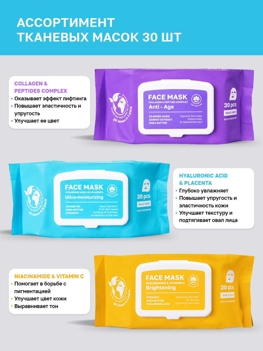 NSC Тканевые маски для лица Коллаген и Пептиды, набор 30 штук