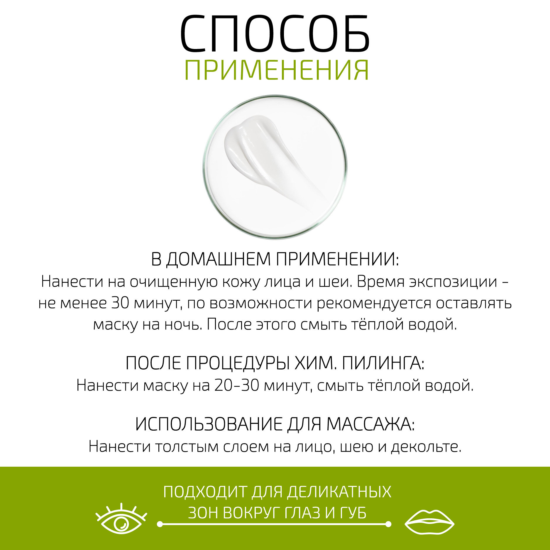 | Способ применения | 1) в домашнем применении нанести на очищенную кожу лица и шеи. Время экспозиции - не менее 30 минут, по возможности рекомендуется оставлять маску на ночь. После этого смыть тёплой водой. 2) После процедуры хим.пилинга нанести маску на 20-30 минут, смыть тёплой водой. 3) Нанести толстым слоем и использовать для массажа лица, шеи и декольте |