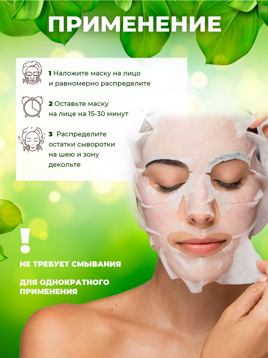 | Способ применения | Наложите маску на чистую кожу лица, распределите, оставьте маску на 15-30 минут, затем снимите и распределите остатки эссенции на коже. |