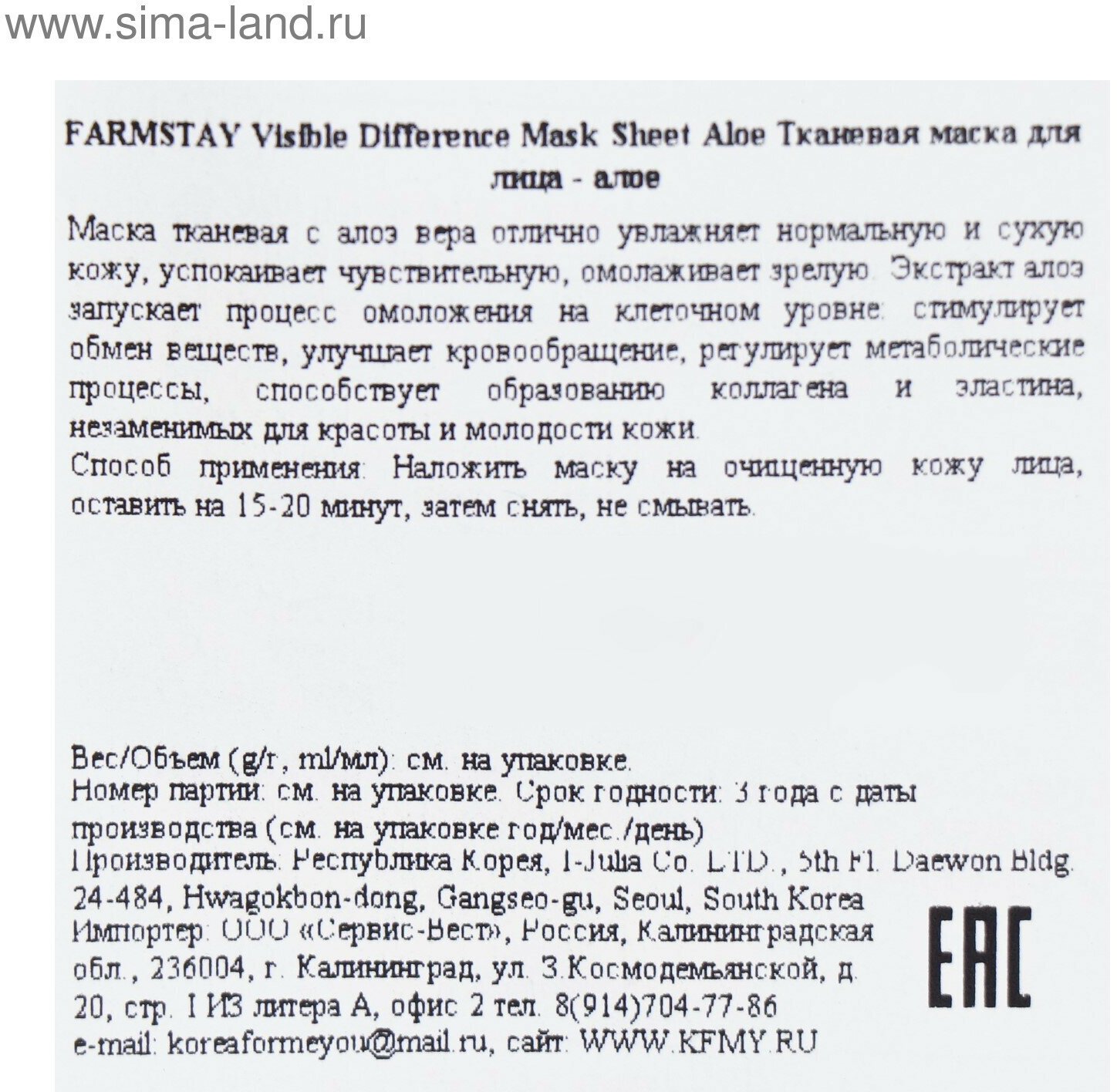 Тканевая маска с экстрактом алоэ FarmStay, 23 мл интересное: