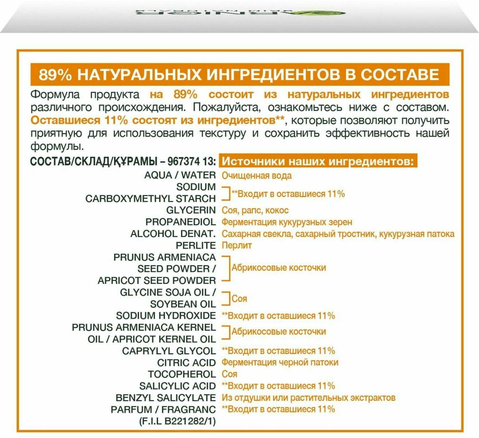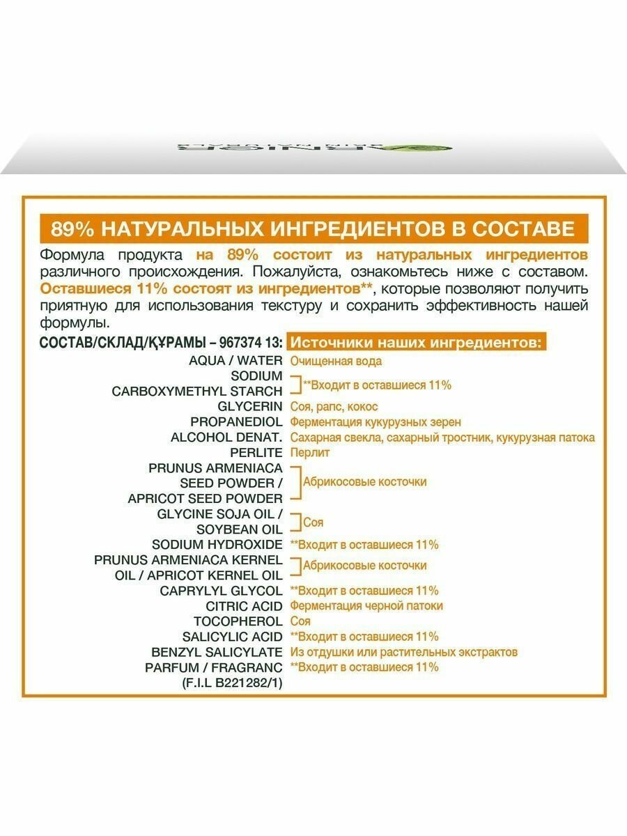 | Состав | aqua/water, sodium carboxymethyl starch, glycerin, propanediol, alcohol denat., perlite, prunus armeniaca, seed powder / apricot seed powder, glycine soja oil / soybean oil, sodium hydroxide, prunus armeniaca kernel oil / apricot kernel oil, caprylyl glycol, citric acid, tocopherol, salicylic acid, benzyl salicylate, parfum / fragrance |
