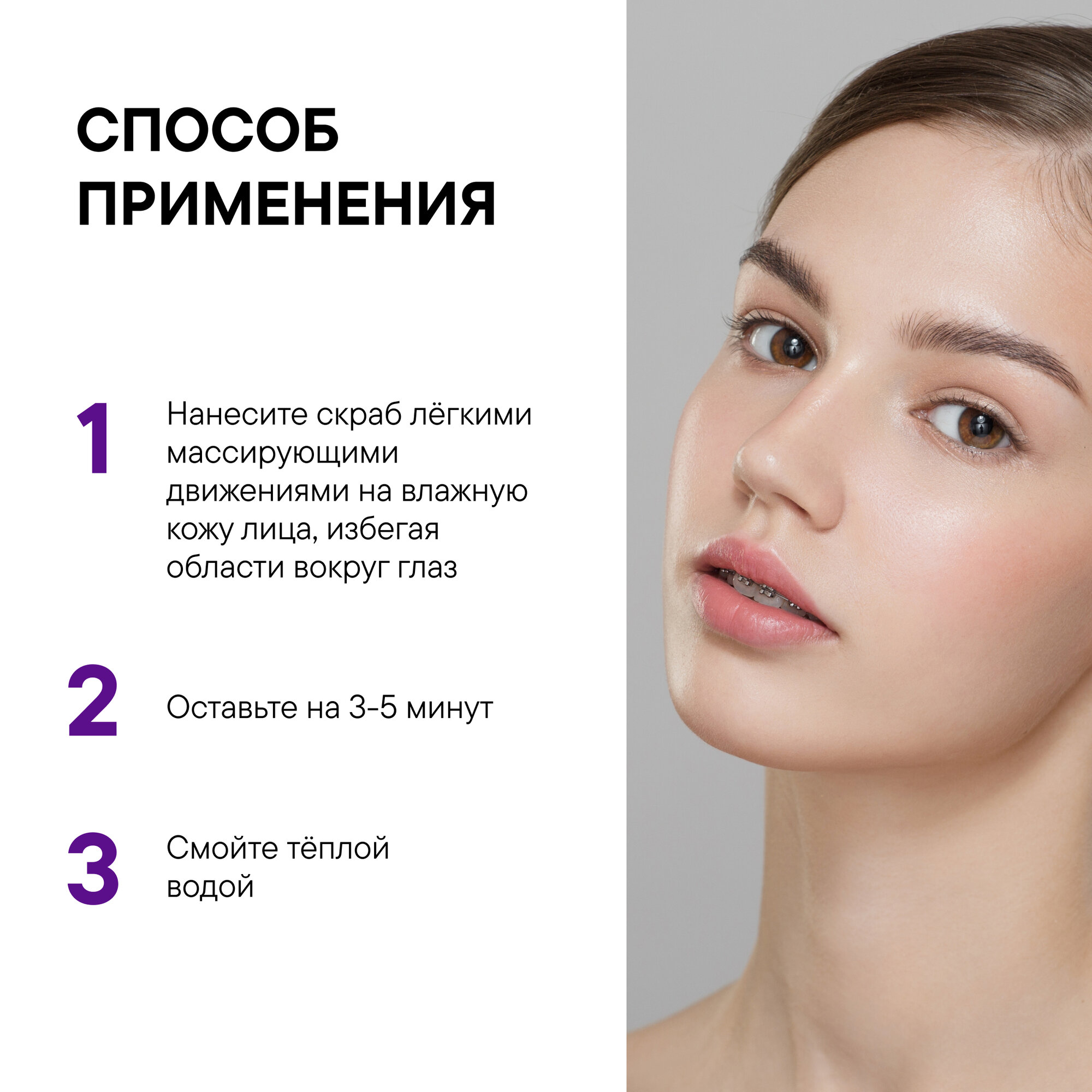 | Способ применения | нанесите скраб лёгкими массирующими движениями на влажную кожу лица, избегая области вокруг глаз. Тщательно смойте водой. |