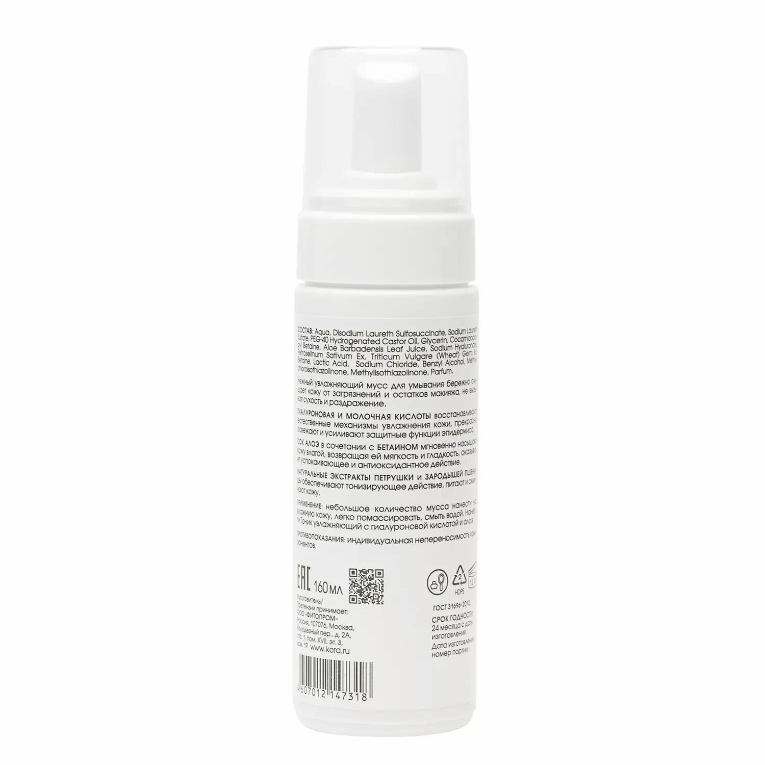 Мусс для умывания увлажняющий с гиалуроновой кислотой, 160 мл, Kora интересное: