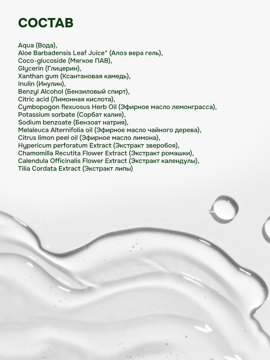 | Состав | aqua (родниковая вода), Сoco-glucoside (из мякоти кокоса и глюкозы) ,Aloe Barbadensis Leaf Juice( сок алое вера), Glycerin ( глицерин), Xanthan gum (ксантановая камедь), Inulin (инулин), Cymbopogon schoenanthuscitric oil (эфирное масло лемонграсса), citric acid (лимонная кислота), Potassium sorbate (сорбат калия), Melaleuca Alternifolia oil (эфирное масло чайного дерева), Сitrus limon oil (эфирное масло лимона), Chamomilla recutita extract (экстракт ромашки), Hypericum perforatum extract (экстракт зверобоя), Benzyl Alcohol (бензиловый спирт), Calendula officinalis extract (экстракт календулы), Tilia Cordata flower extract (экстракт липы) |