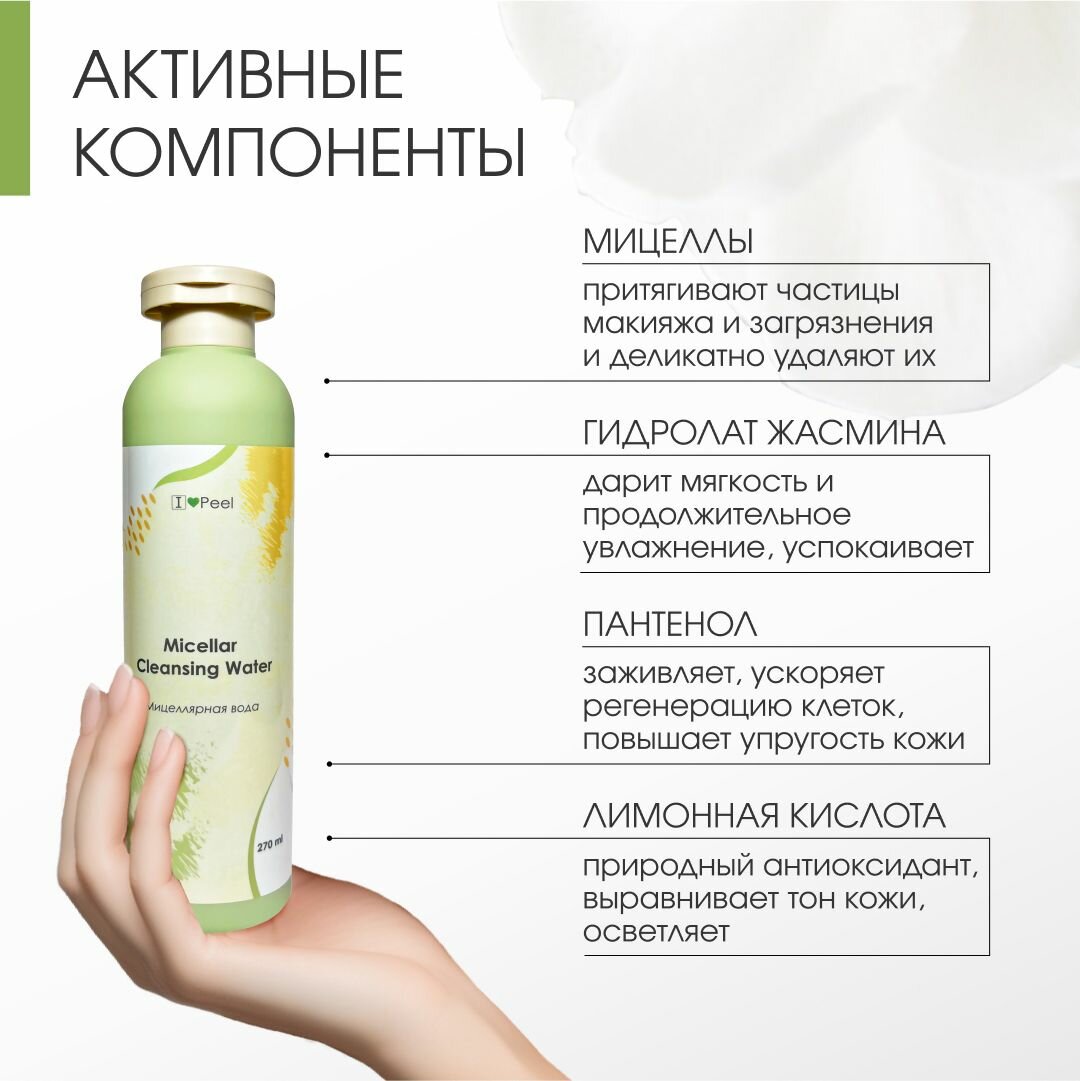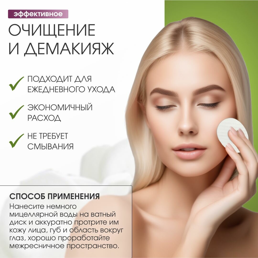 | Способ применения | **Как использовать мицеллярную воду:** 1. Нанесите небольшое количество мицеллярной воды на ватный диск. 2. Очистите кожу лица, глаз и губ, делая мягкие движения. 3. Повторяйте процедуру до тех пор, пока ватный диск не будет чистым. 4. Не требуется смывание водой |