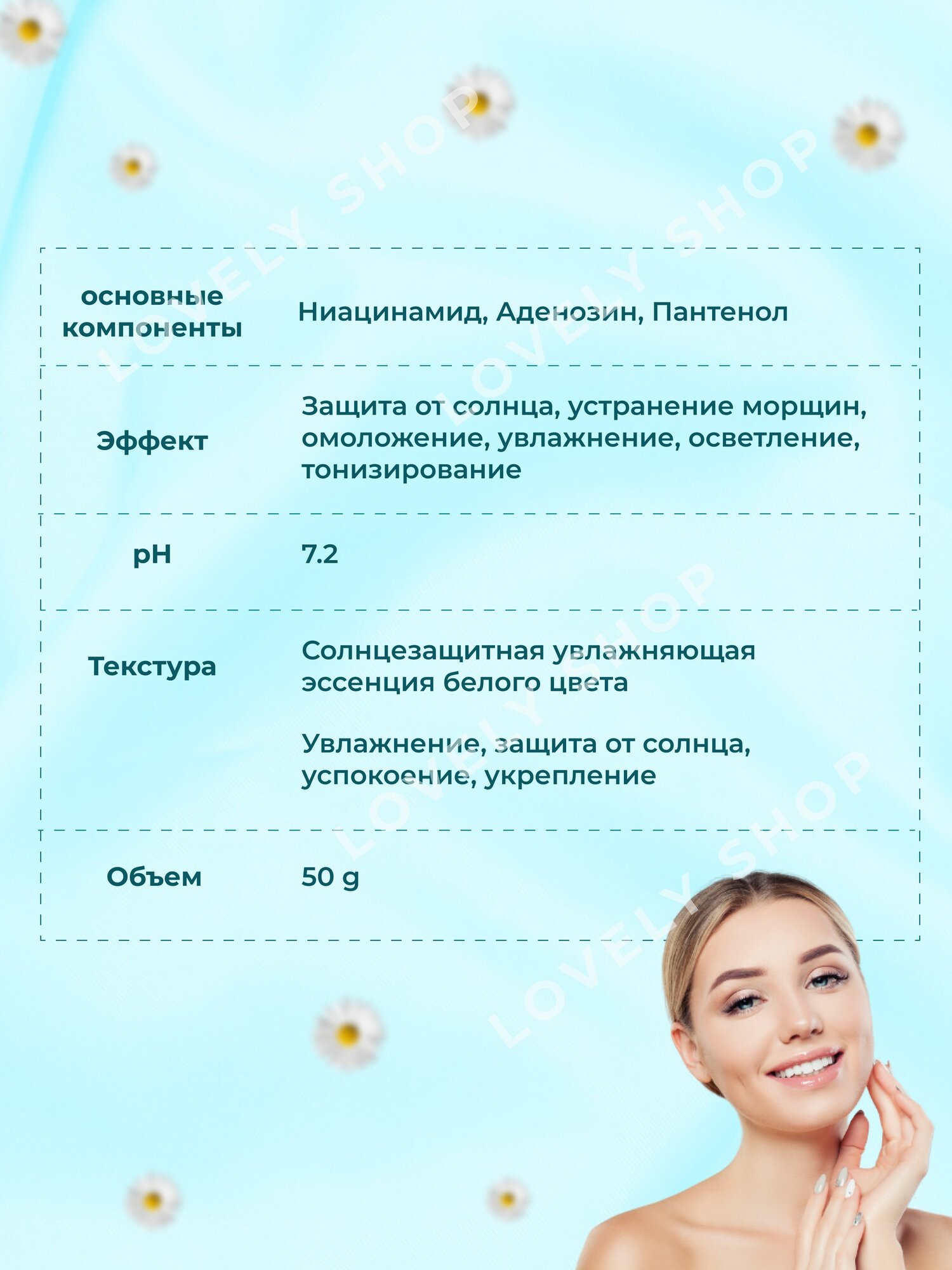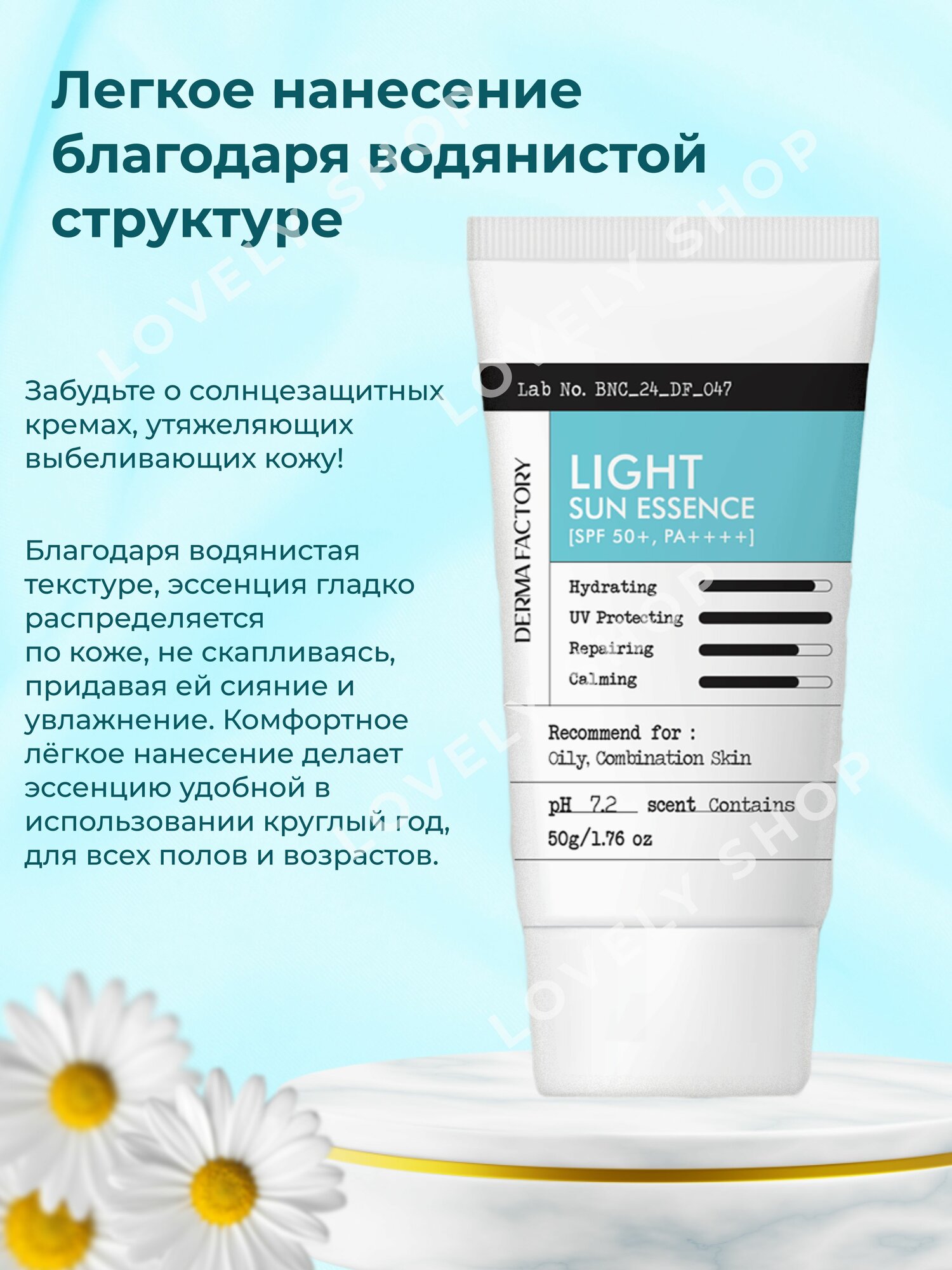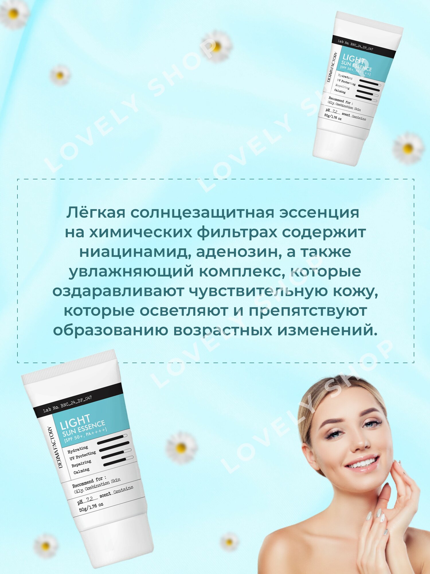 | Дополнительная информация | Лосьон для лица спф 50, корейский уход, крем спф 50 корея, крем для лица спф 50, солнцезащитный крем, спф 50, derma factory spf, защита от солнца, крем от солнца корея, крем для лица essence, |