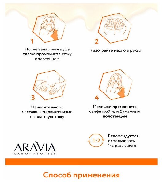 | Способ применения | нанесите масло массажными движениями сразу после ванны или душа на влажную кожу, слегка промокнув ее полотенцем. Перед нанесением разогрейте масло в руках. Излишки промокните салфеткой или бумажным полотенцем. Рекомендуется использовать 1-2 раза в день. |