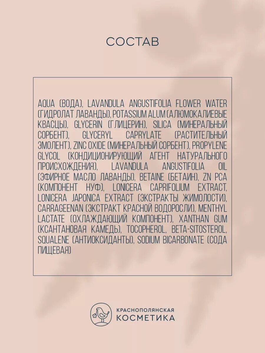 | Полный состав | Aqua (Вода), Citrus Reticulata Fruit Water (Гидролат мандарина), Potassium Alum (Алюмокалиевые квасцы), Glycerin (Глицерин), Silica (Минеральный сорбент), Glyceryl Caprylate (Растительный эмолент), Zinc Oxide (Минеральный сорбент), Propylene Glycol (Кондиционирующий агент натурального происхождения), Ванилин (Vanillin), Betaine (Бетаин), Zn PCA (Компонент НУФ), Lonicera Caprifolium Extract, Lonicera Japonica Extract (Экстракты жимолости), Parfum (Натуральная парфюмерная композиция), Sclerotium Gum (Камедь склероции), Carrageenan (Экстракт красной водоросли), Menthyl Lactate (Охлаждающий компонент), Xanthan Gum (Ксантановая камедь), Tocopherol, Beta-Sitosterol, Squalene (Антиоксиданты), Sodium Bicarbonate (Сода пищевая). |