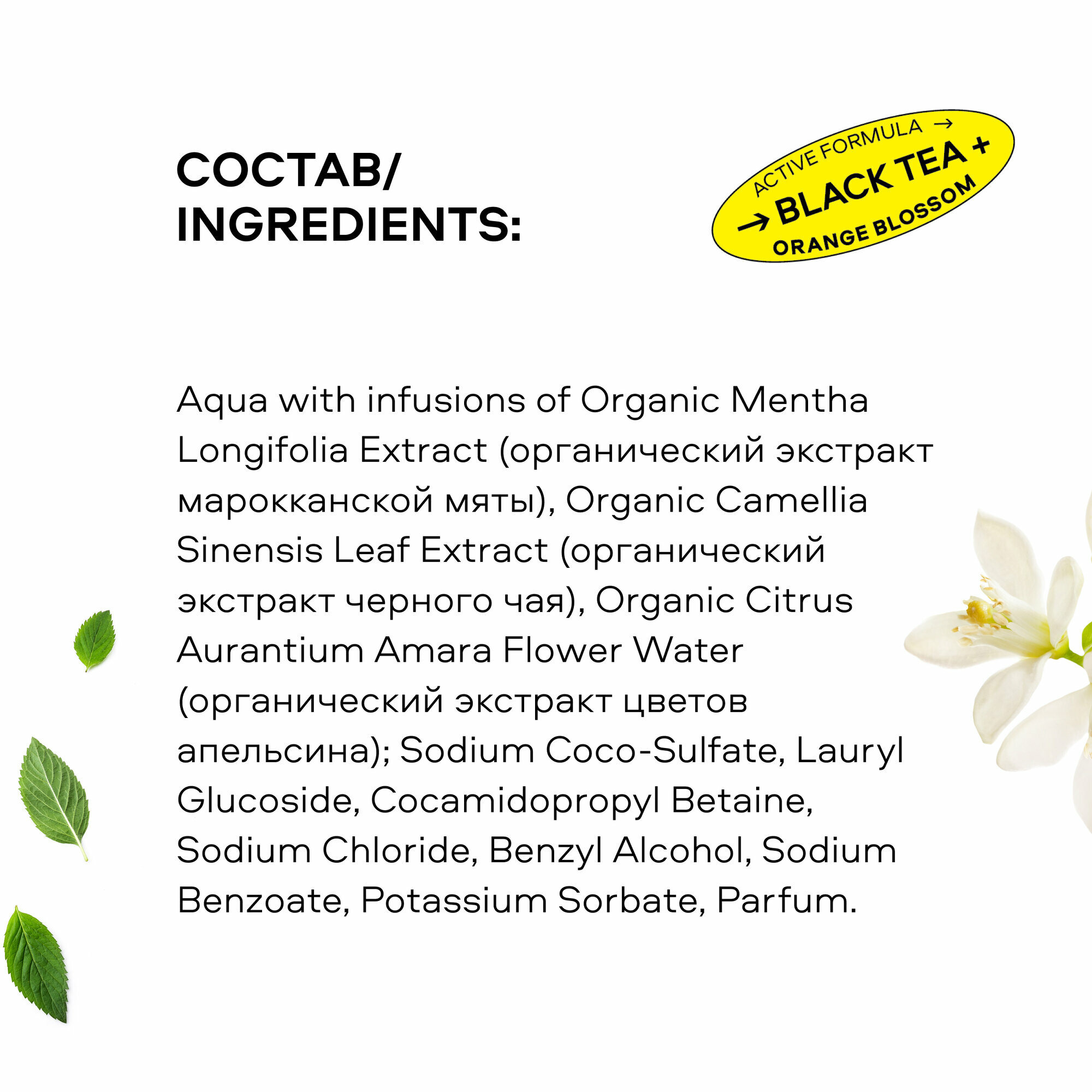 | Состав | Aqua with infusions of Organic Mentha Longifolia Extract (органический экстракт марокканской мяты), Organic Camellia Sinensis Leaf Extract (органический экстракт черного чая), Organic Citrus Aurantium Amara Flower Water (органический экстракт цветов апельсина); Sodium Coco-Sulfate, Lauryl Glucoside, Cocamidopropyl Betaine, Sodium Chloride, Benzyl Alcohol, Sodium Benzoate, Potassium Sorbate, Parfum, CI 15985, CI 19140, CI 42090, CI 14720. |