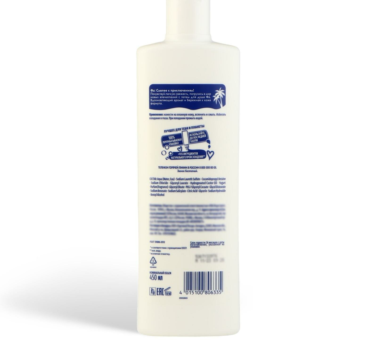 | Состав | Aqua (Water, Eau),Sodium Laureth Sulfate,Cocamidopropyl Betaine,Sodium Chloride,Yogurt,Guar Hydroxypropyltrimonium Chloride,Parfum (Fragrance),Glycol Distearate,Disodium Laureth Sulfosuccinate,Laureth-4,Hydrogenated Castor Oil,PEG-7 Glyceryl Cocoate,PEG-40 Hydrogenated Castor Oil,Sodium Hydroxide,Citric Acid,Hexyl Cinnamal,Geraniol,Citronellol,Sodium Benzoate,Sodium Salicylate,Benzyl Alcohol |