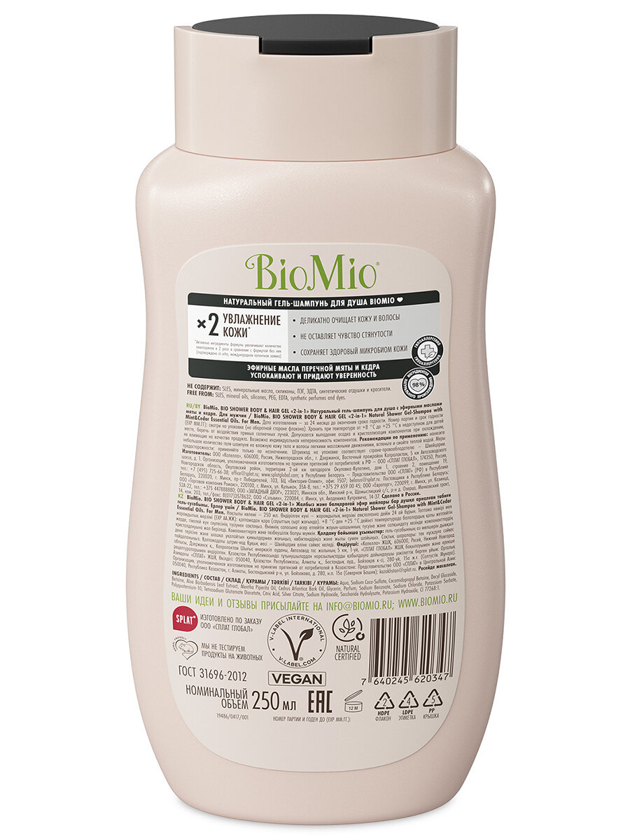 Купить Гель-шампунь для душа BioMio 2в1 с эфирными маслами мяты и кедра 250мл