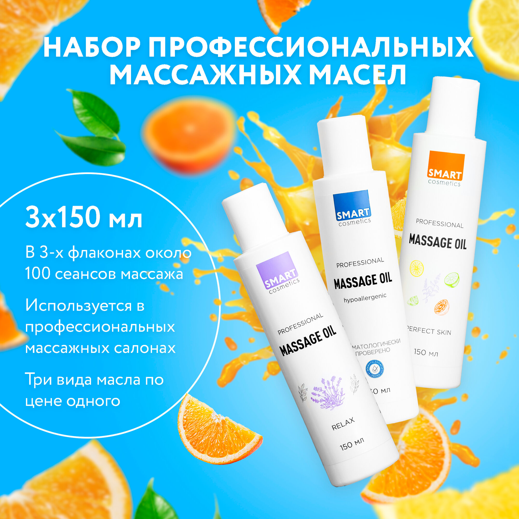 Купить Набор Профессиональных массажных масел Smart Cosmetics, 450 мл/ Масло массажное Гипоаллергенное, Relax, Perfect skin