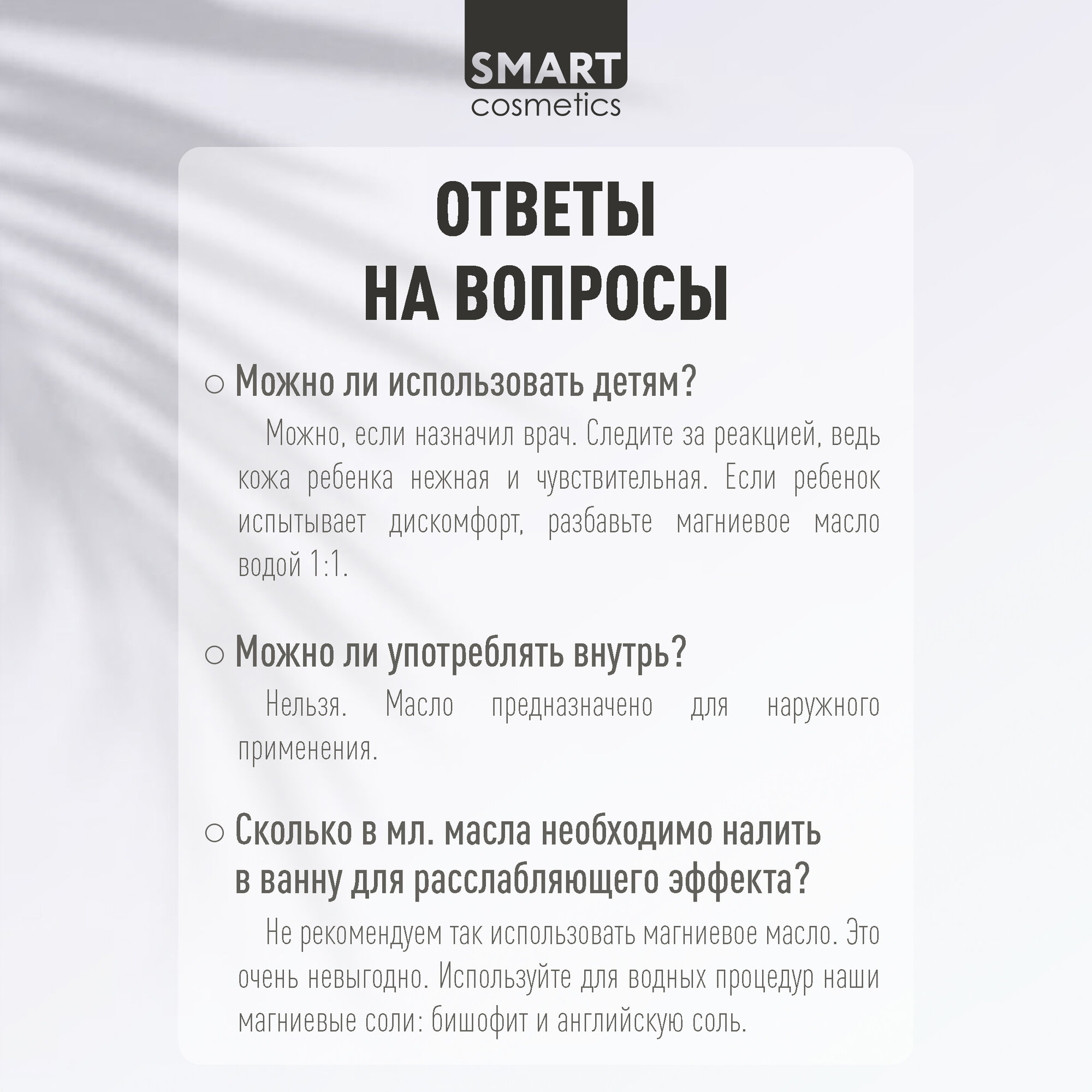 Ниже Вы можете прочитать отзывы на Магниевое масло для тела, волос, кожи головы Smart Cosmetics / Magnesium oil / Натуральное массажное масло с магнием, 250 мл, ознакомится с подробными характеристиками, посмотреть интересные обзоры и фотографии на Магниевое масло для тела, волос, кожи головы Smart Cosmetics / Magnesium oil / Натуральное массажное масло с магнием, 250 мл.