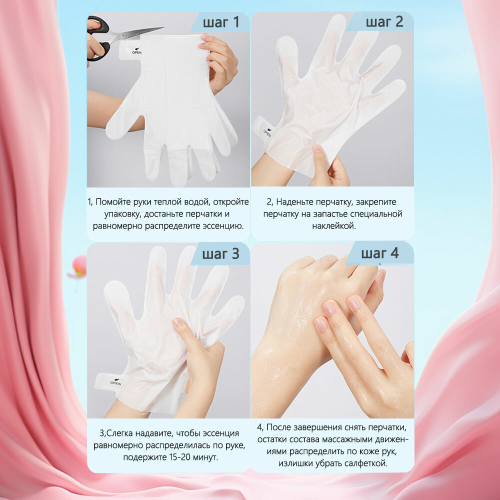 | Способ применения | 1. Перед использованием вымыть руки, вытереть насухо. 2. Вскрыть упаковку, вынуть маску, сделать надрез по разметке. 3. Надеть маски на руки, закрепить клеевыми стикерами, так перчатки не будут спадать. 4. Помассируйте руки легкими движениями, чтобы сыворотка лучше распределилась по коже и впиталась. 5. Оставьте перчатки на 15-20 минут. Не используйте маску повторно. |