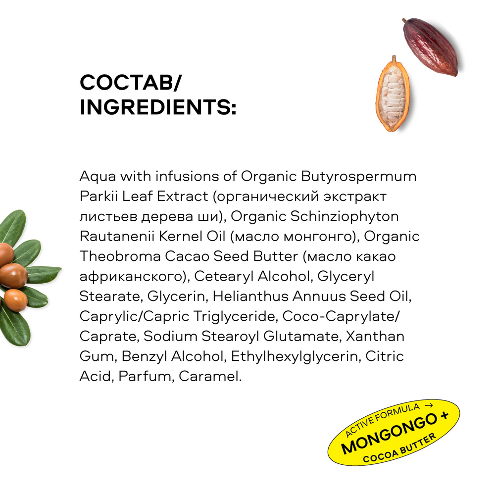 | Cостав | Aqua with infusions of Organic Butyrospermum Parkii Leaf Extract (органический экстракт листьев дерева ши), Organic Schinziophyton Rautanenii Kernel Oil (масло монгонго), Organic Theobroma Cacao Seed Butter (масло какао африканского), Cetearyl Alcohol, Glyceryl Stearate, Glycerin, Helianthus Annuus Seed Oil, Caprylic/Capric Triglyceride, Coco-Caprylate/ Caprate, Sodium Stearoyl Glutamate, Xanthan Gum, Benzyl Alcohol, Ethylhexylglycerin, Citric Acid, Parfum, Caramel. |