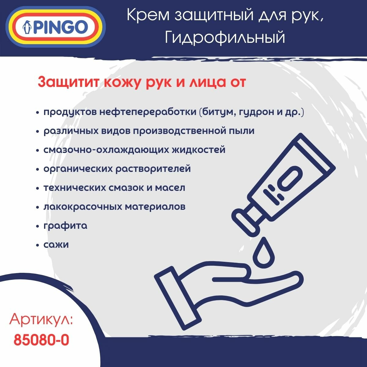 | Способ применения | перед началом работы на чистую сухую кожу равномерно нанести небольшое количество крема. После высыхания крема и образования пленки можно начинать работать. Не оставляет отпечатков пальцев. Не препятствует дыханию кожи. Не содержит силикона |