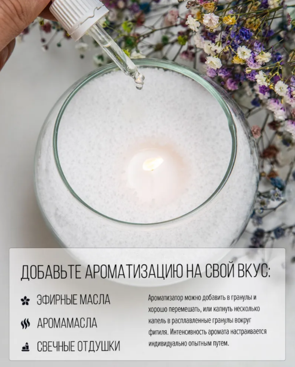 | Дополнительная информация | После тушения дайте воску остыть, затем удалите огарок. Оставшиеся гранулы можно использовать повторно. |