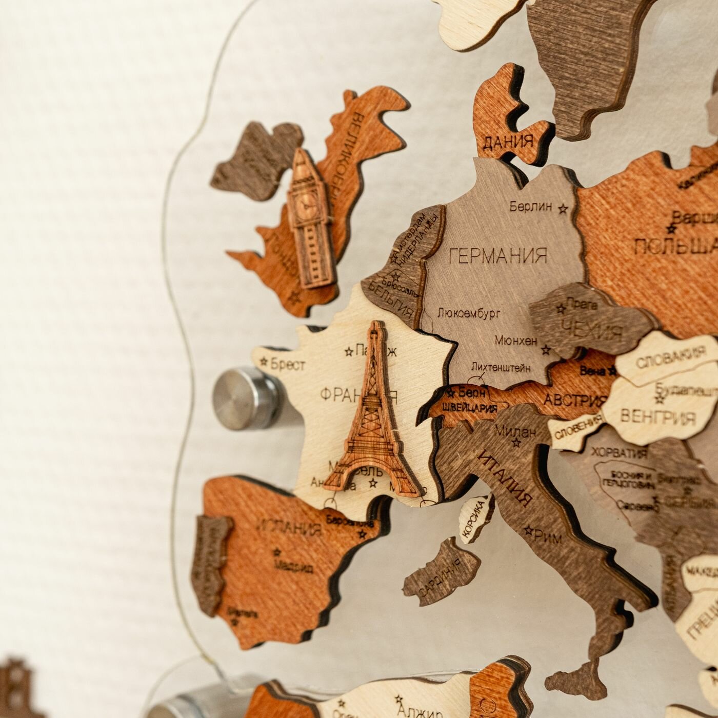 Карта мира из дерева с подсветкой на подложке из оргстекла