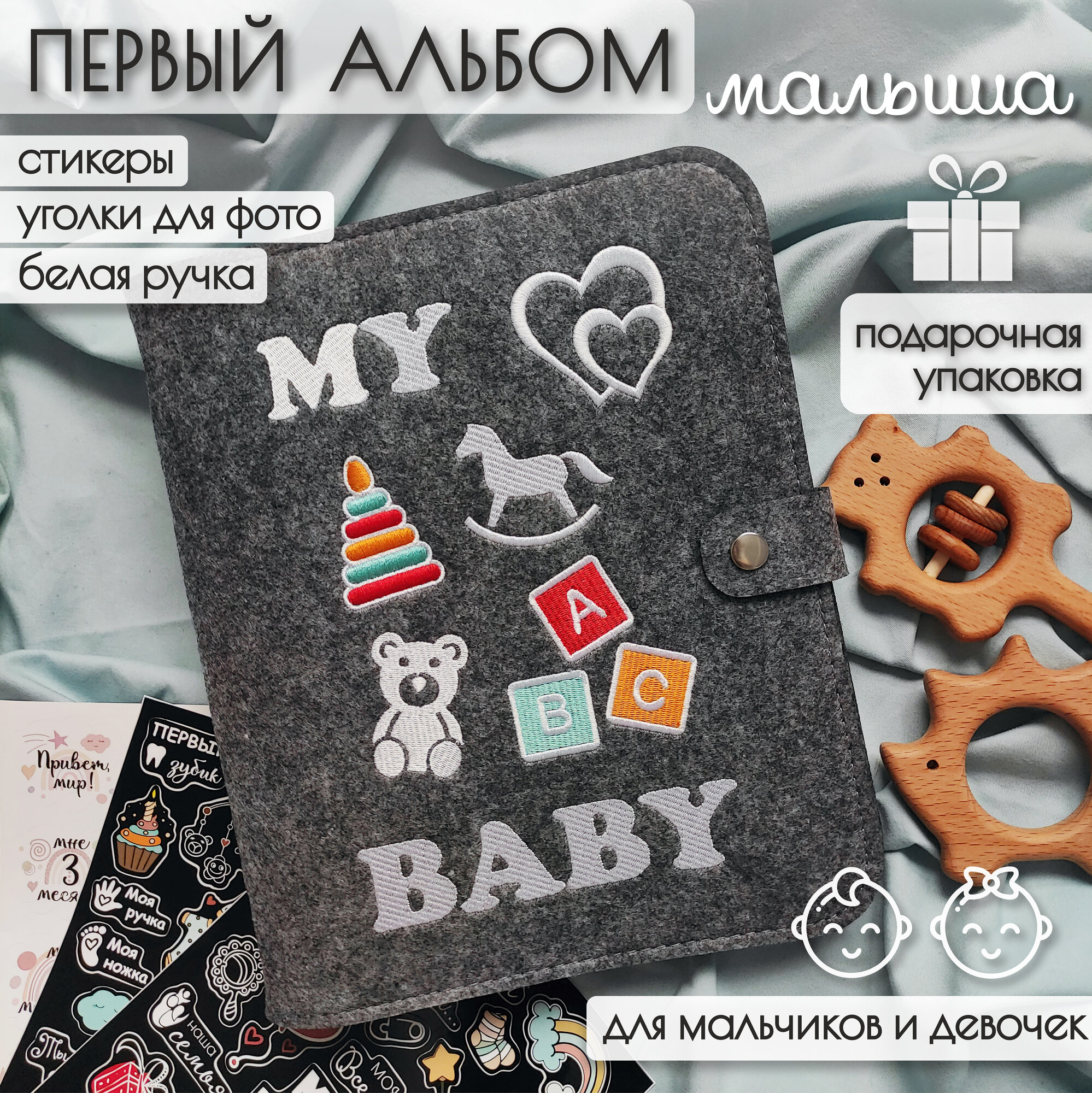 Купить "Детский фотоальбом Memories Life с наклейками серый с вышивкой рисунка игрушек"