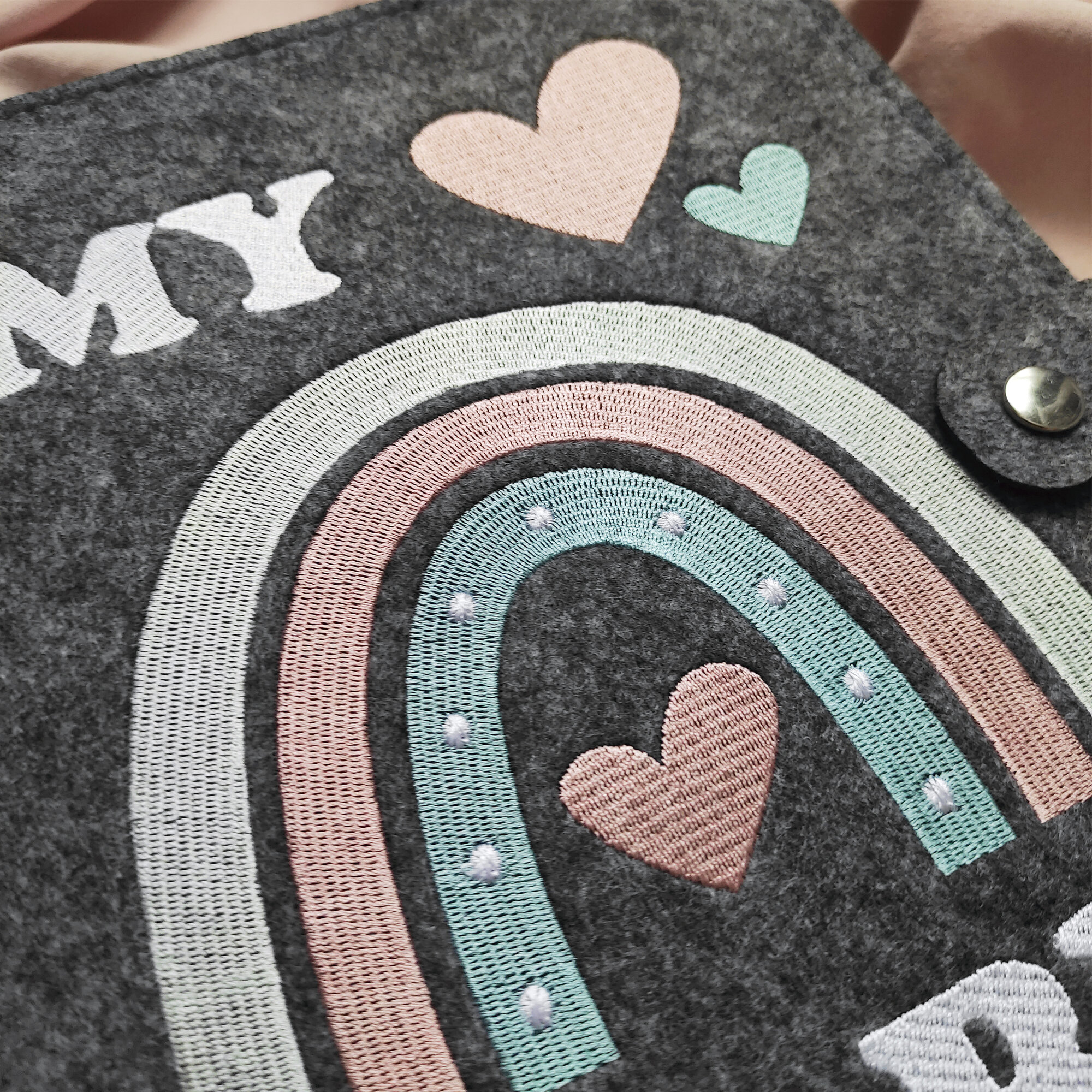 Детский фотоальбом Memories Life с наклейками светло-серый с вышивкой рисунка радуги