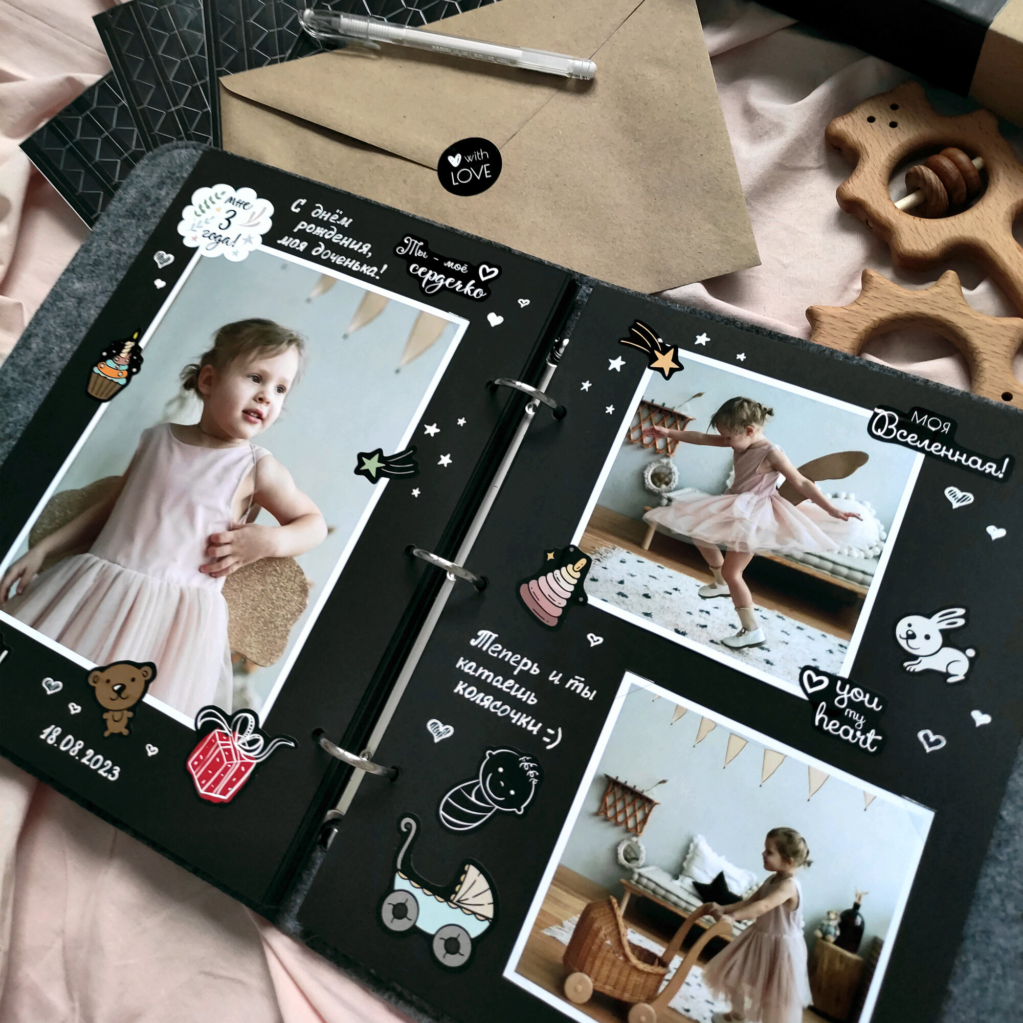 "Детский фотоальбом Memories Life с наклейками серый с вышивкой рисунка игрушек"