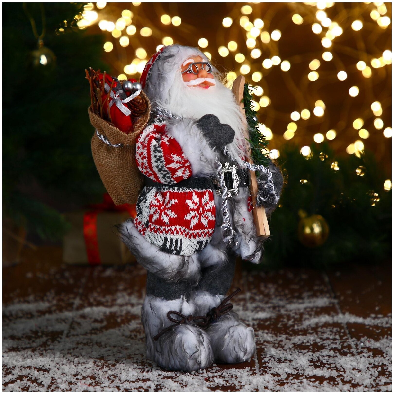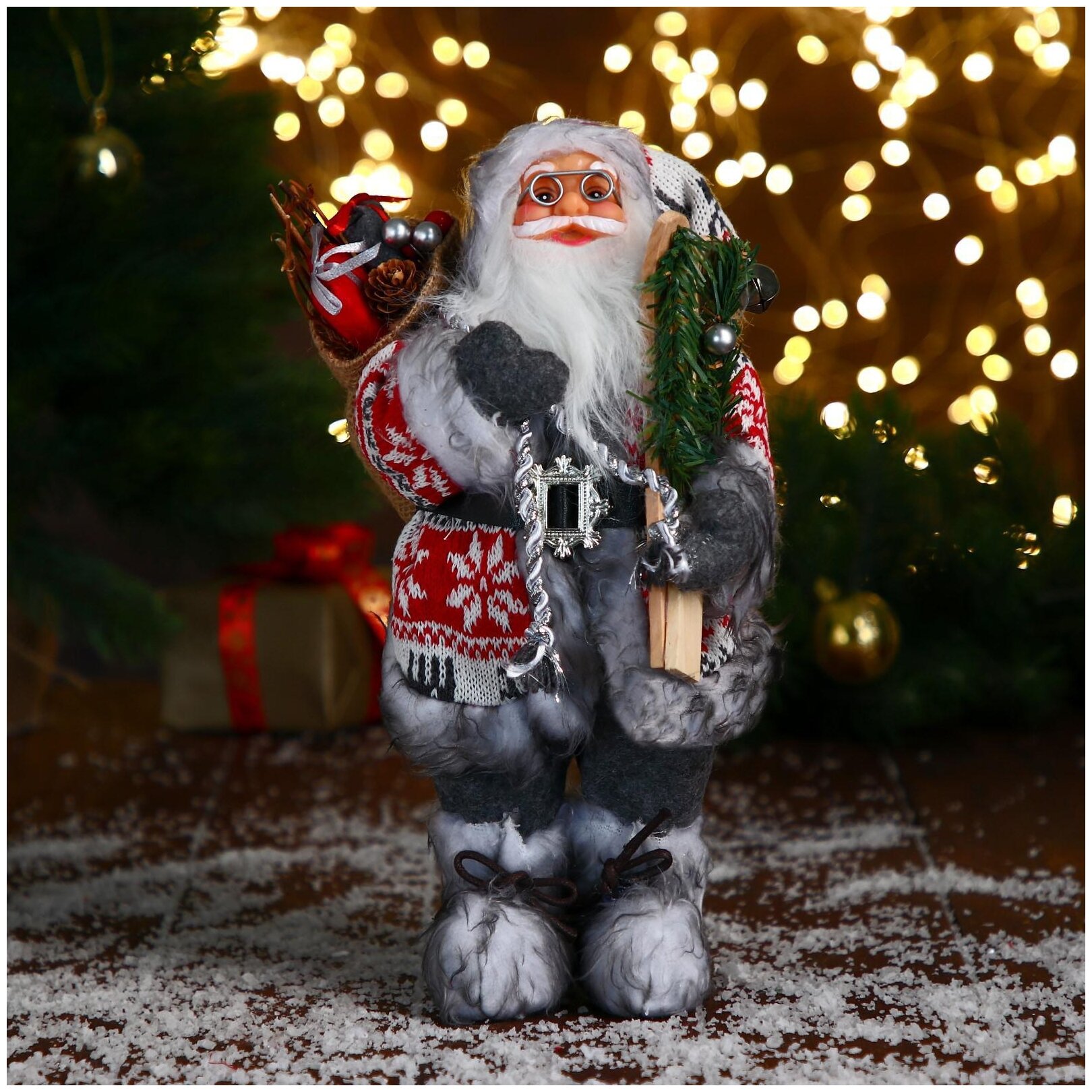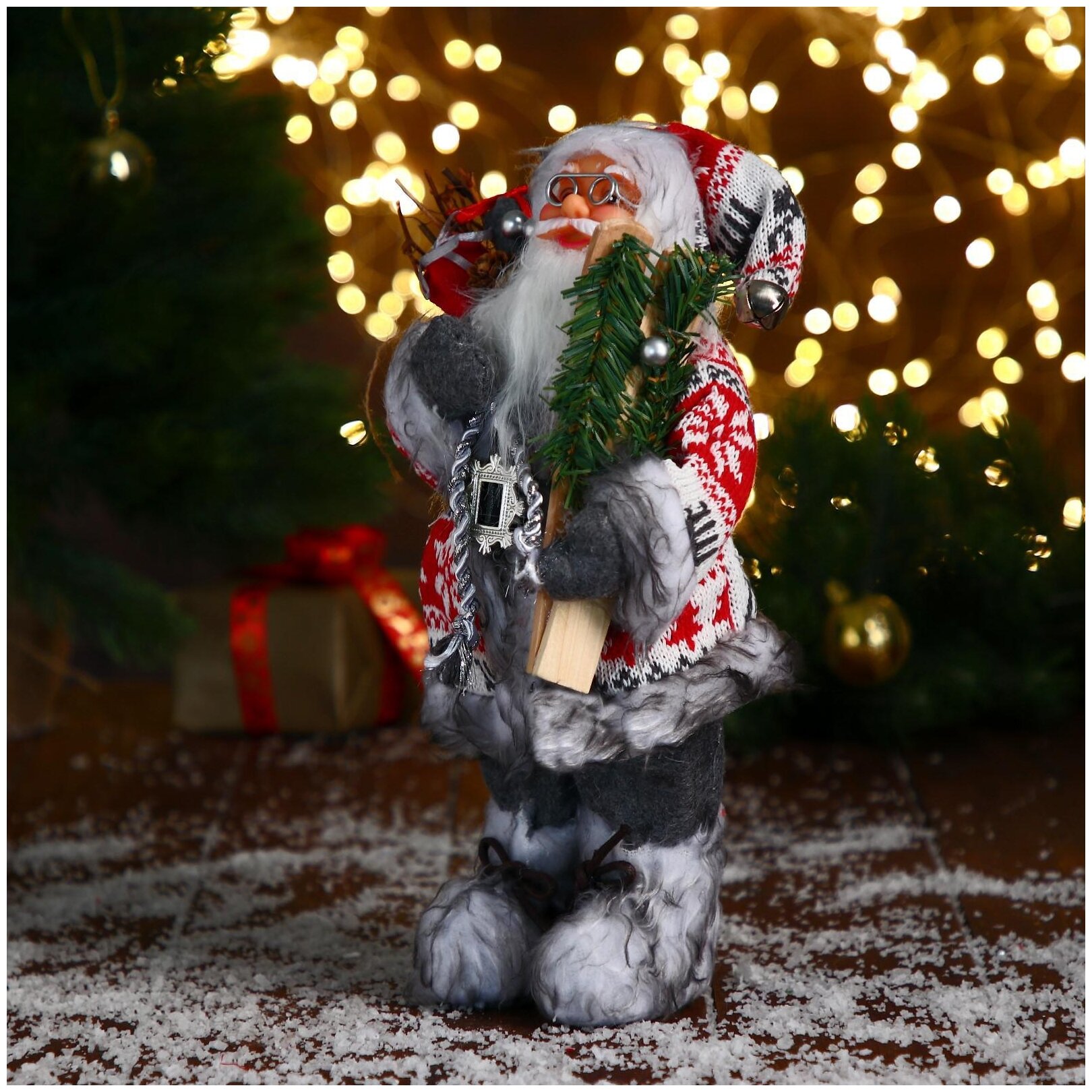 Дед Мороз под ёлку "Зимнее волшебство. Новогодняя игрушка в бело-красной шубке с ремешком, с лыжами", 45 см