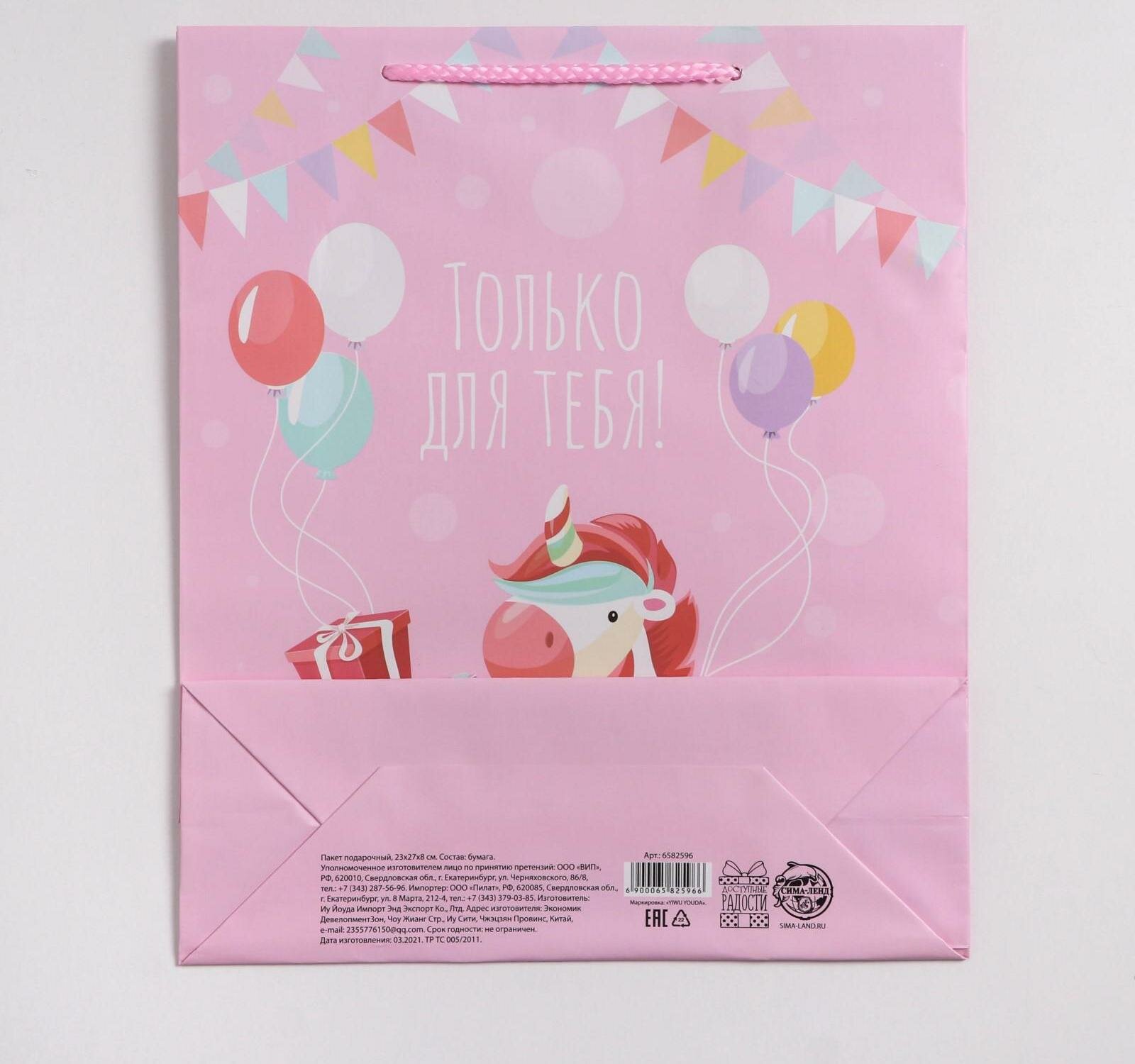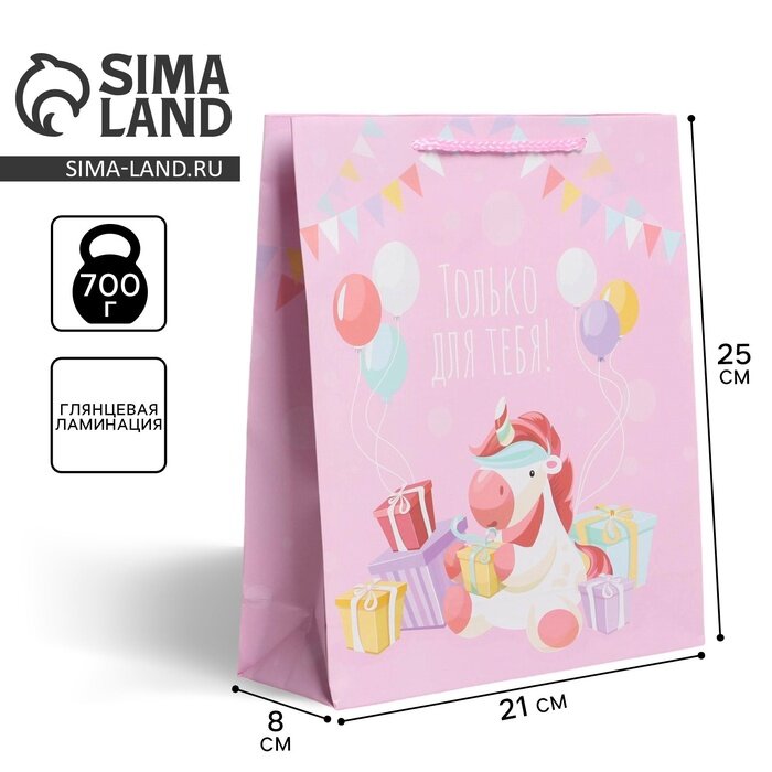 Пакет подарочный «Только для тебя», 21 х 25 х 8 см, розовый, для упаковки подарка ребенку