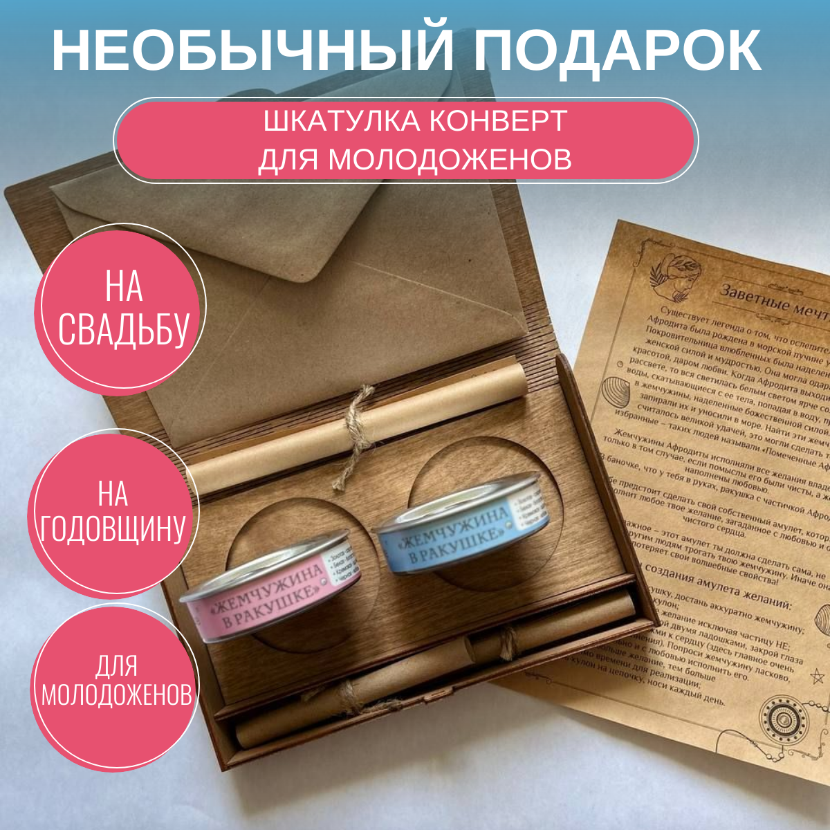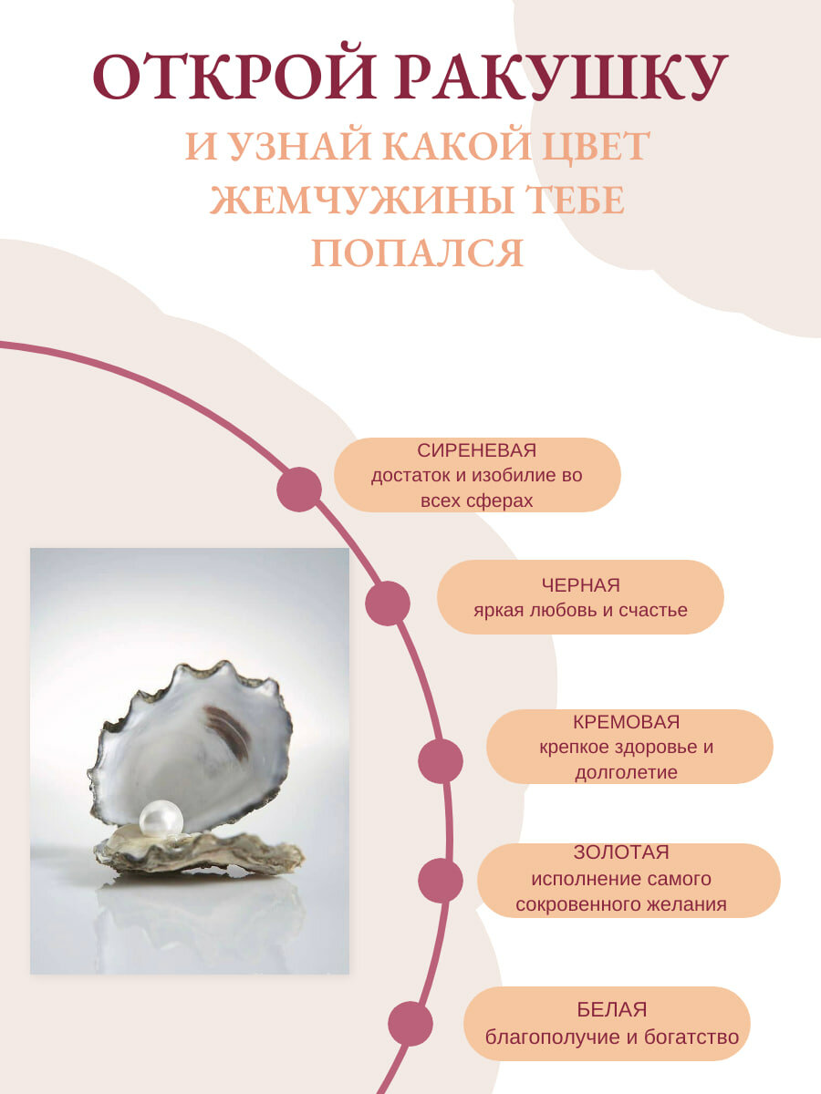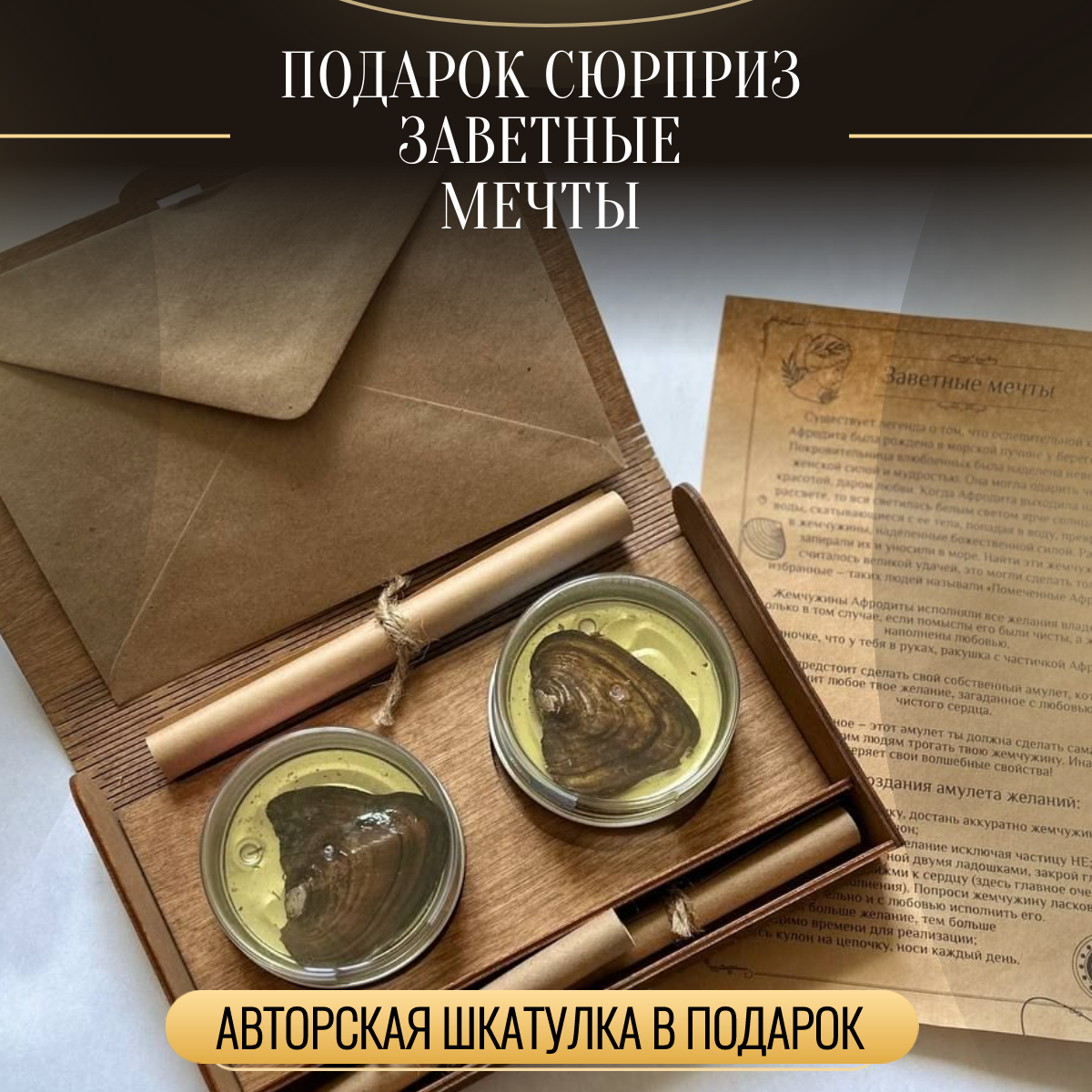 | Подробная комплектация | Комплектация - Деревянная коробка-шкатулка. - 2 ракушки с жемчугом. - Крафт конверт для денег - Легенда о жемчуге - Техника загадывания желаний - Инструкция. - Сургучная печать. |