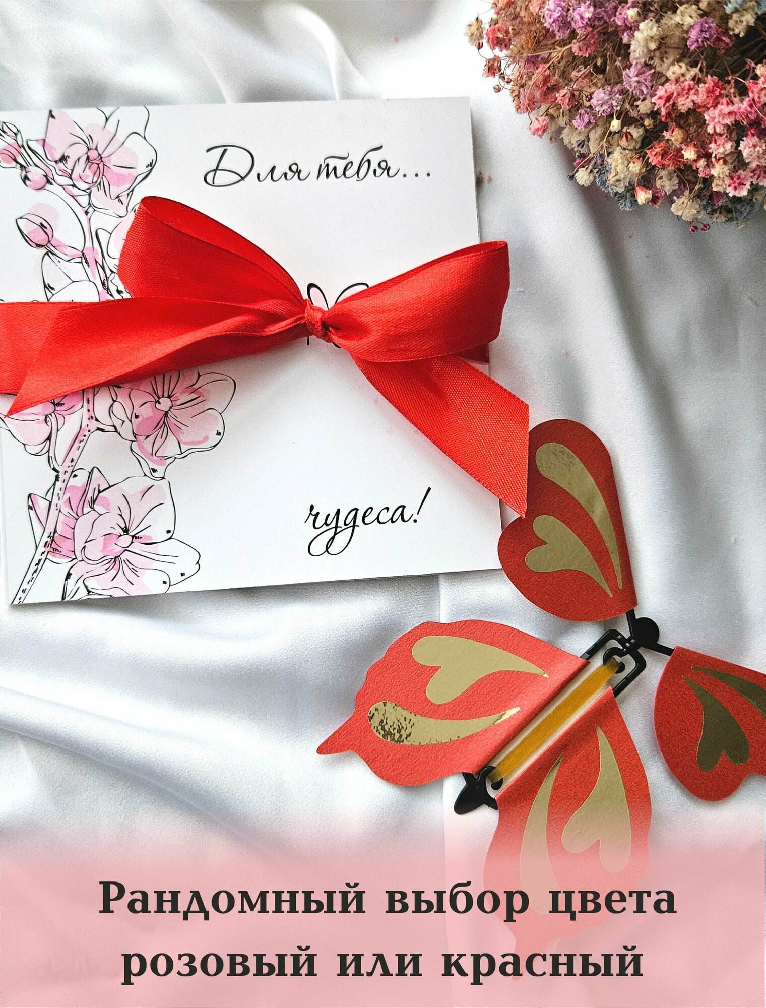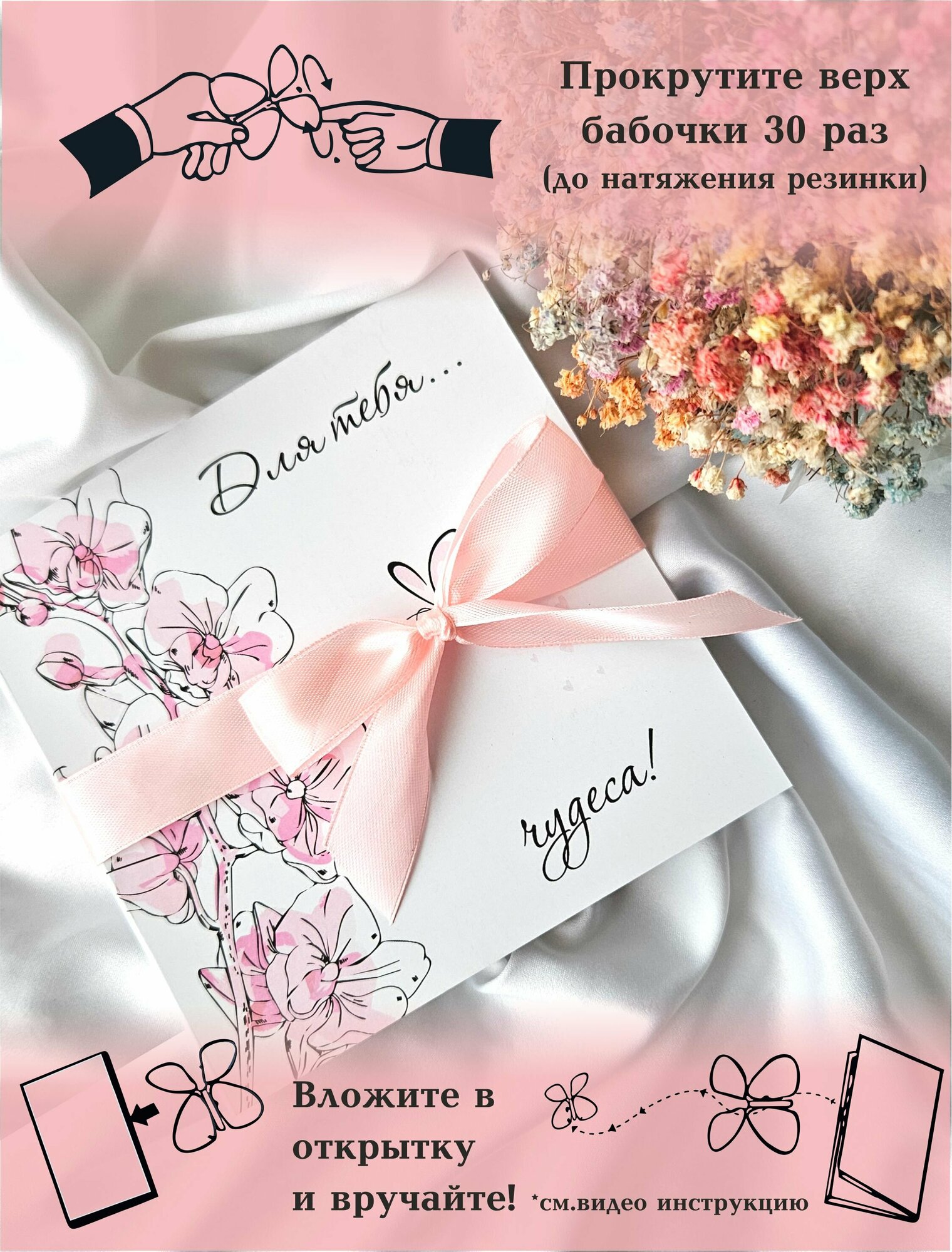 | Подробная комплектация | двусторонняя открытка книжкой, бабочка, лента-бант |
