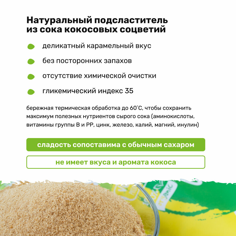 | Состав | 100% кокосовый сахар из сока кокосовых соцветий |