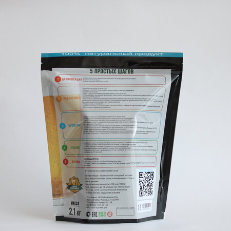 | Состав | Состав набора (внутри дой-пака): Неохмелённый солодовый экстракт - 2.1 кг, Хмель для пива гранулированный - 2 сорта, Дрожжи сухие пивные (10 грамм) |