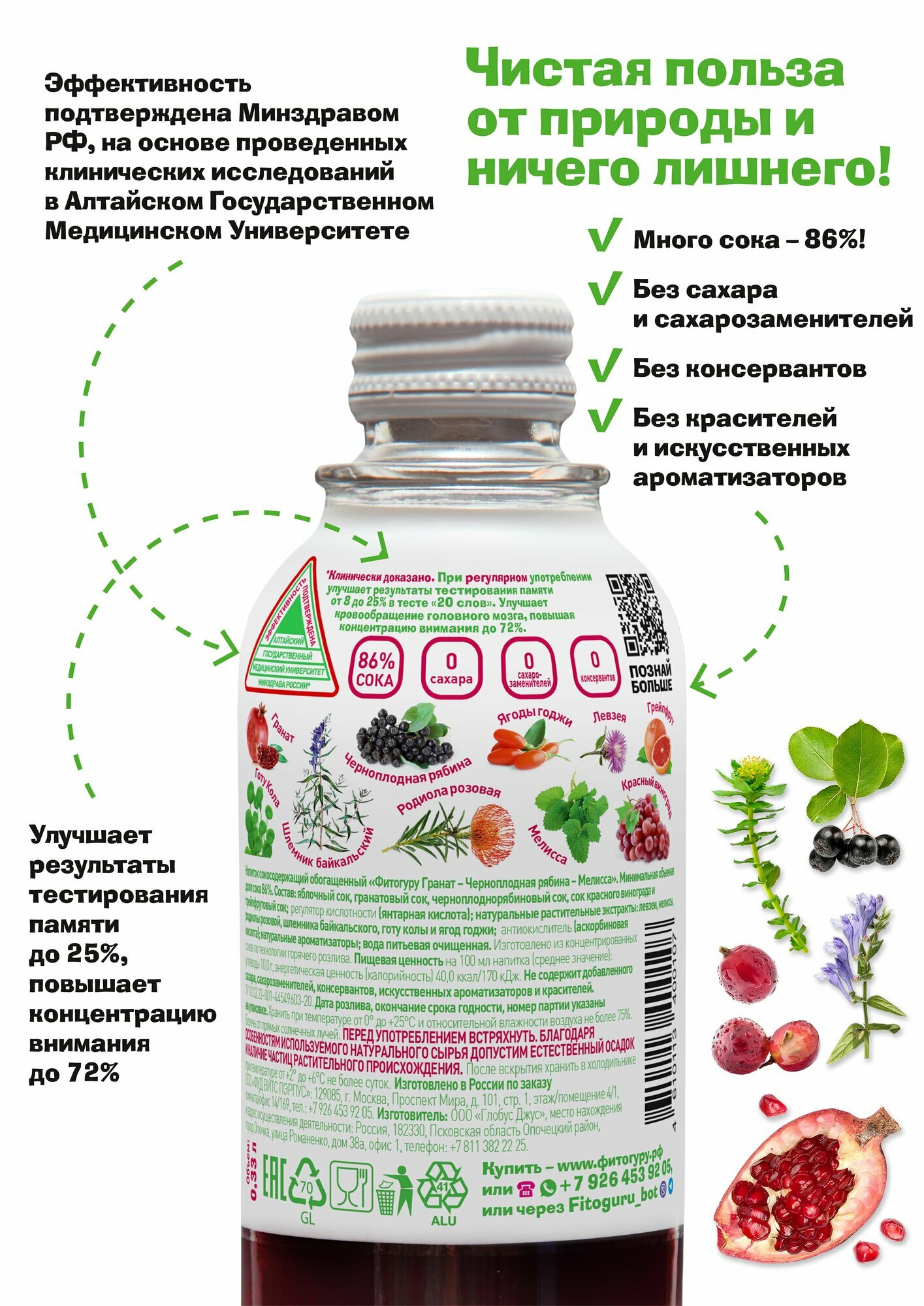 | Состав | Яблочный сок, гранатовый сок, черноплоднорябиновый сок, сок красного винограда и грейпфрута; регулятор кислотности ( янтарная кислота); натуральные растительные экстракты: левзеи, мелисы, родиолы розовой, шлемника байкальского, готу колы и ягод годжи, антиокислитель (аскорбиновая кислота); натуральный арматизатор, вода питьевая очищенная. |