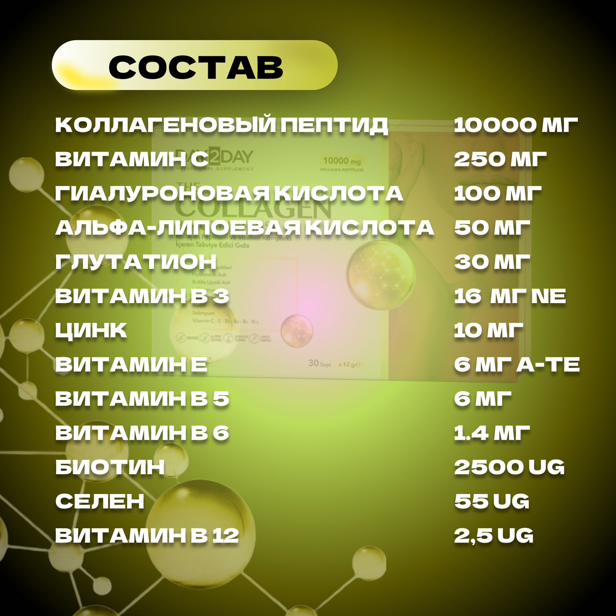 | Состав | Коллагеновый пептид 10000 мг Витамин C 250 мг Гиалуроновая кислота 100 мг Альфа-липоевая кислота 50 мг Глутатион 30 мг Витамин B3 16 мг Цинк 10 мг Витамин E 6 мг Витамин B5 6 мг Витамин B6 1,4 мг Биотин 2500 мг Селен 55 мг Витамин B12 2,5 мг |