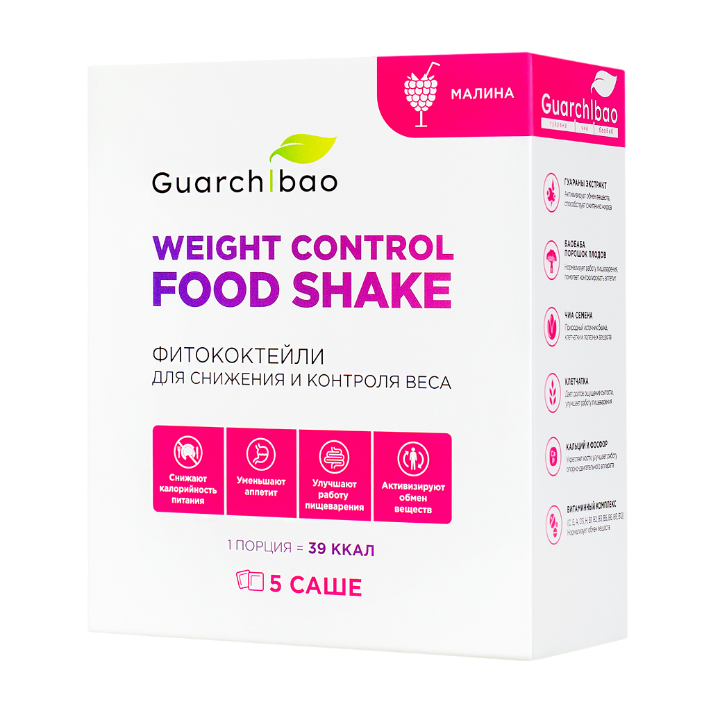 Купить Низкокалорийные коктейли для похудения и замены питания Guarchibao Weight Control FOOD SHAKE со вкусом Малины. Снижение аппетита/ Белок, клетчатка