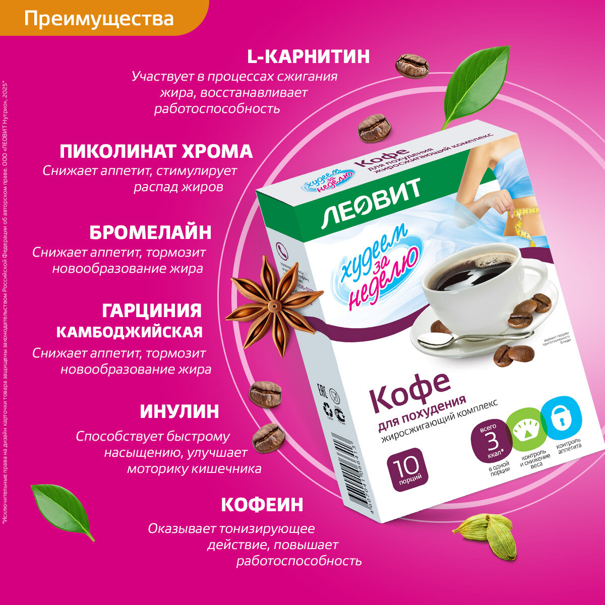 | Состав | Кофе растворимый, пищевые волокна (инулин), L-карнитин, витамин С, экстракт гарцинии камбоджийской, бромелайн, пиколинат хрома, корица, куркума, кардамон, имбирь. |