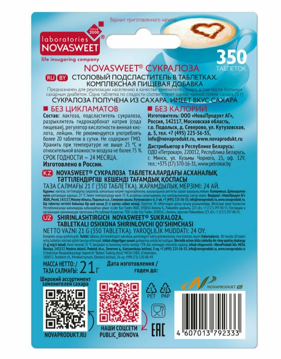 Novasweet Заменитель сахара в таблетках "Сукралоза", 350 таблеток интересное: