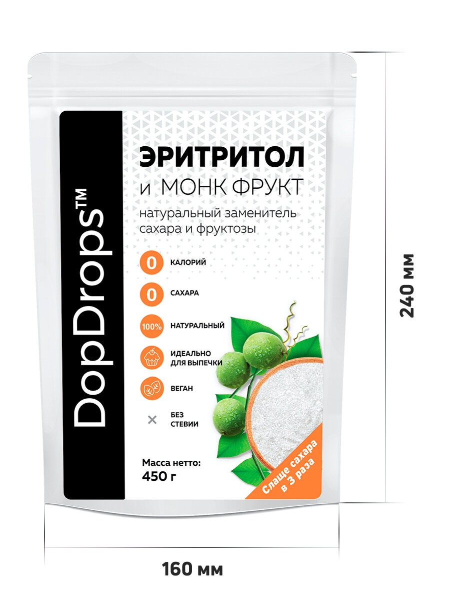 Купить Натуральный сахарозаменитель DopDrops Эритритол (Эритрит) с Монк Фрукт, в 3 раза слаще сахара, 450 г