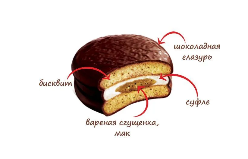 | Состав | мука пшеничная общего назначения тип М 55-23, сахар, патока, вода питьевая, жир кондитерский (рафинированные дезодорированные растительные масла: пальмовое, подсолнечное, соевое; антиокислитель (концентрат смеси токоферолов), эмульгатор (лецитин соевый)), жир специального назначения (рафинированные дезодорированные растительные масла: пальмовое, пальмоядровое, ши; эмульгаторы (лецитин соевый, сорбитан тристеарат)), варёное сгущённое молоко с сахаром (молоко нормализованное, сахар), мак пищевой, яичные продукты, какао порошок, молоко сухое цельное, лактоза, агенты влагоудерживающие (глицерин, сорбитовый сироп), цельное сгущённое молоко с сахаром (молоко цельное, молоко обезжиренное, сахар, лактоза), разрыхлители (гидрокарбонат натрия, гидрокарбонат аммония, ортофосфат кальция 1-замещенный), глюкоза, желатин пищевой, соль, какао тертое, ароматизаторы, молочный белок, загуститель (ксантановая камедь), эмульгатор (лецитин соевый) |