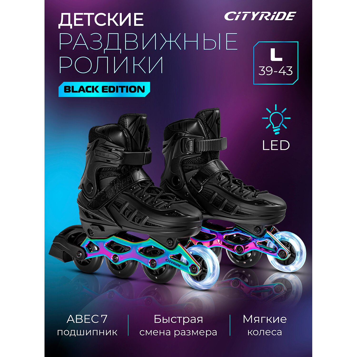 Купить Роликовые коньки детские ТМ CITY-RIDE, PU колеса, первое колесо светится, подшипники ABEC 7, размер L(39-42), раздвижные, JB8800107