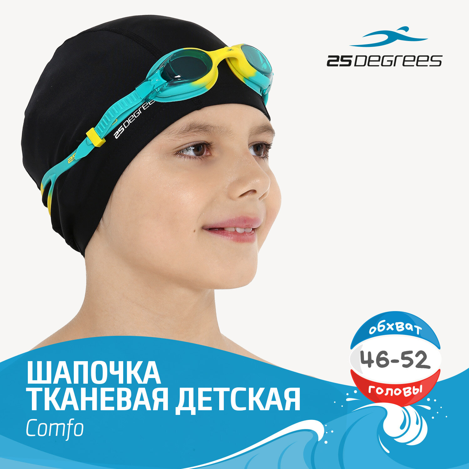 Шапочка для плавания 25DEGREES Comfo детская, цвет черный, размер 45-50