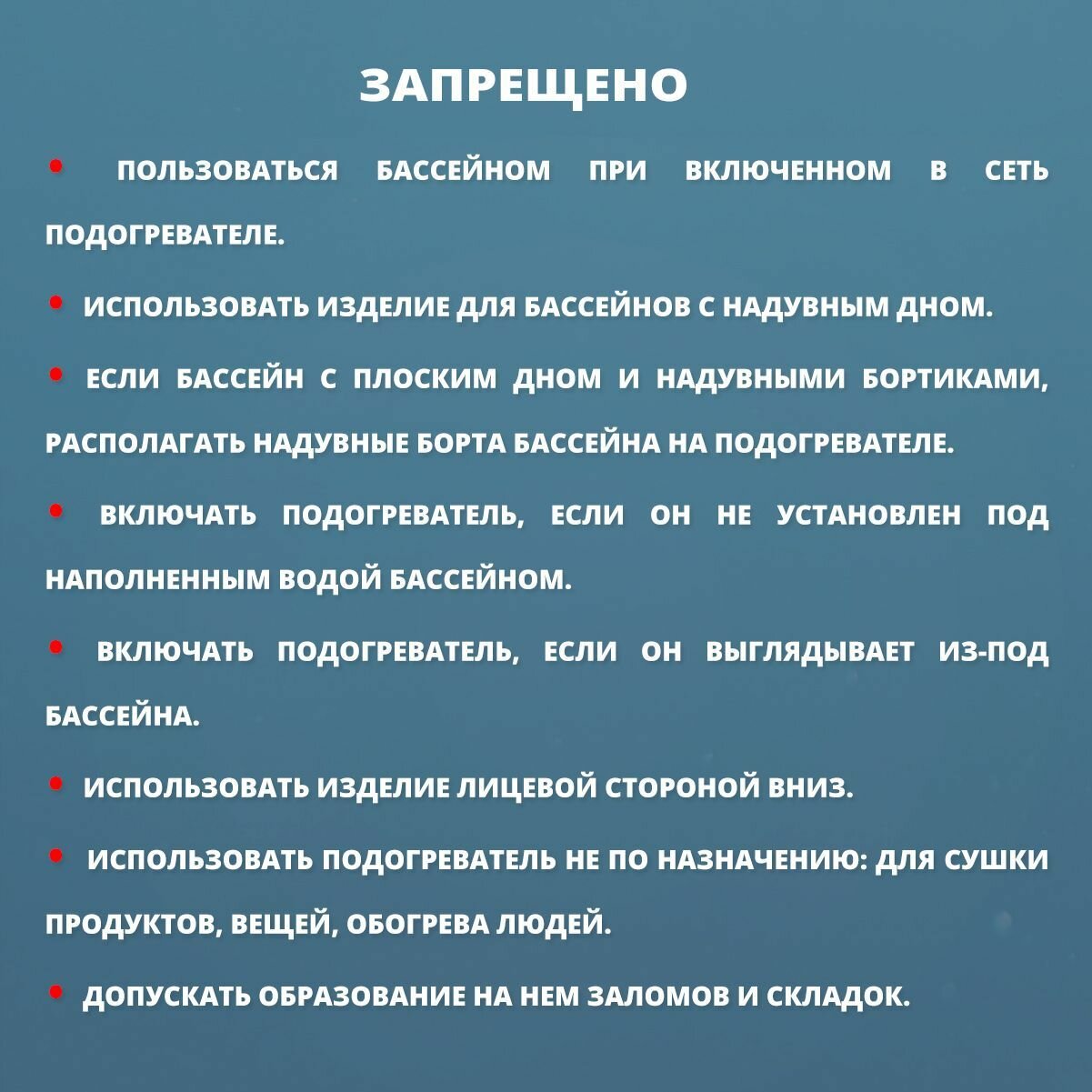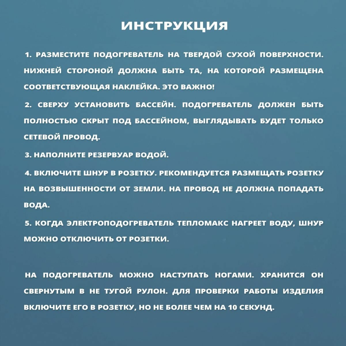 | Дополнительная информация | температура при кратковременном включении в сеть без установки под бассейн до 90C, рабочая температура при установке под бассейном с водой 40-45С; длина сетевого шнура 2,2 м |
